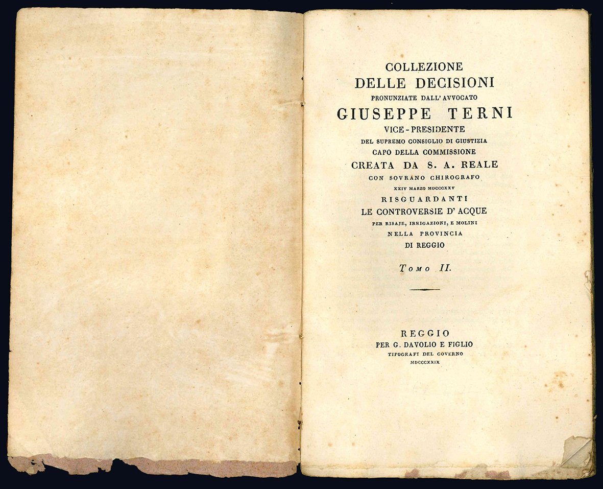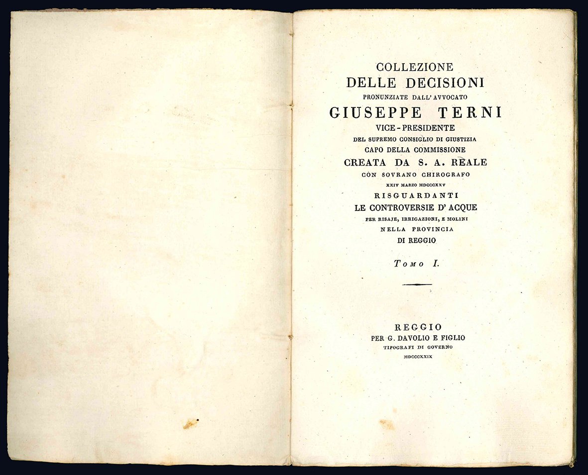 Collezione delle decisioni pronunziate dall'Avv. Giuseppe Terni vice-presidente del supremo consiglio di giustizia capo della commissione creata da S. A. Reale con sovrano chirografo XXIV marzo MDCCCXXV risguardanti le controversie d'acque per risaje, irrigazioni e molini nella Provincia di Reggio. Tomo I (-II).