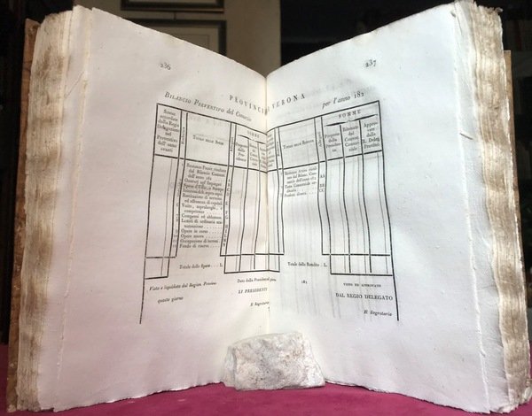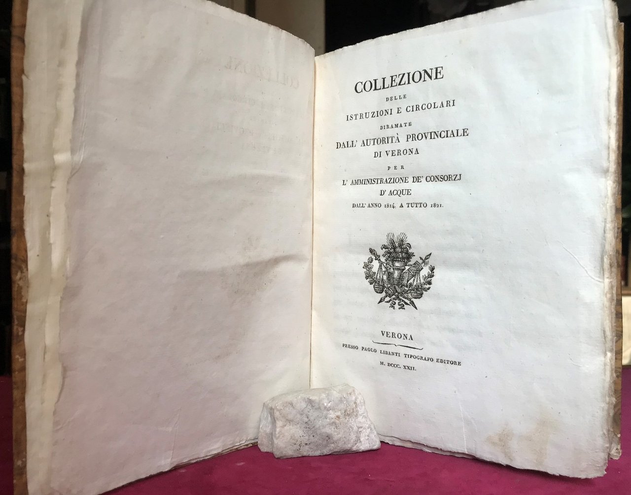 Volume in 8,cartoncino rigido, titolo al dorso, sguardie, frontespizio, indice, 468 pp. Importante ed estremamente interessante raccolta di atti e disposizioni emanati dall'autorit provinciale di Verona dal 1814 al 1821 sulla condotta delle acque sia per irrigazione che per altri usi. Manutenzione, legislazione, norme preventive in materia di amministrazione dei consorzi idrici, tutto ampiamente trattato e codificato. Ennesimo esempio dell'ottima legislazione austroungarica. Ottimo lo stato di conservazione, carta di eccellente qualit con lievi e rare fioriture, essenziale e di scarsissima reperibilit.