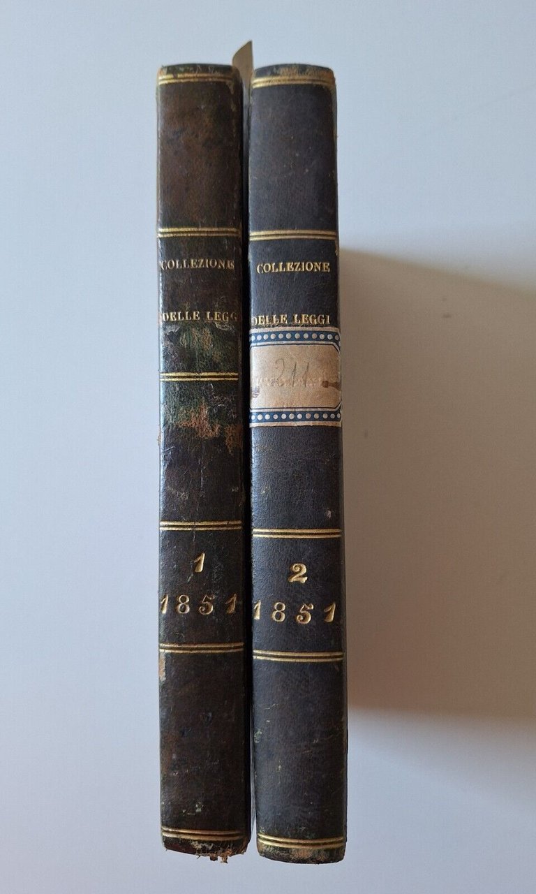 COLLEZIONE DELLE LEGGI E DE' DECRETI REALI DEL REGNO DELLE DUE SICILIE ANNO 1851NAPOLI DALLA STAMPERIA REALEIn 8° , 2 volumi, legatura in mezza pelle con titolo in oro al dorso.Lievissimi segni alle legature. Pagine fresche e pulite.