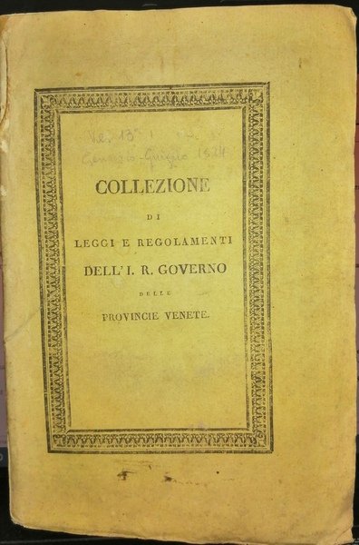 Collezione di leggi, e regolamenti normali della direzione del censo e dell'imposizioni dirette. Dall'anno 1819 a tutto il 1821 che fa parte della collezione pubblicata dall'Imp. Regio Governo delle Provincie Venete. In oggetti di amministrazione politica, camerale e giudiziaria. Volume ventesimoquarto. Anno 1833. II semestre.