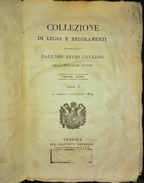 Collezione di leggi, e regolamenti pubblicati dall'Imp. Regio Governo delle Provincie Venete.Volume sesto. Parte I. Da gennaio a tutto giugno 1819.