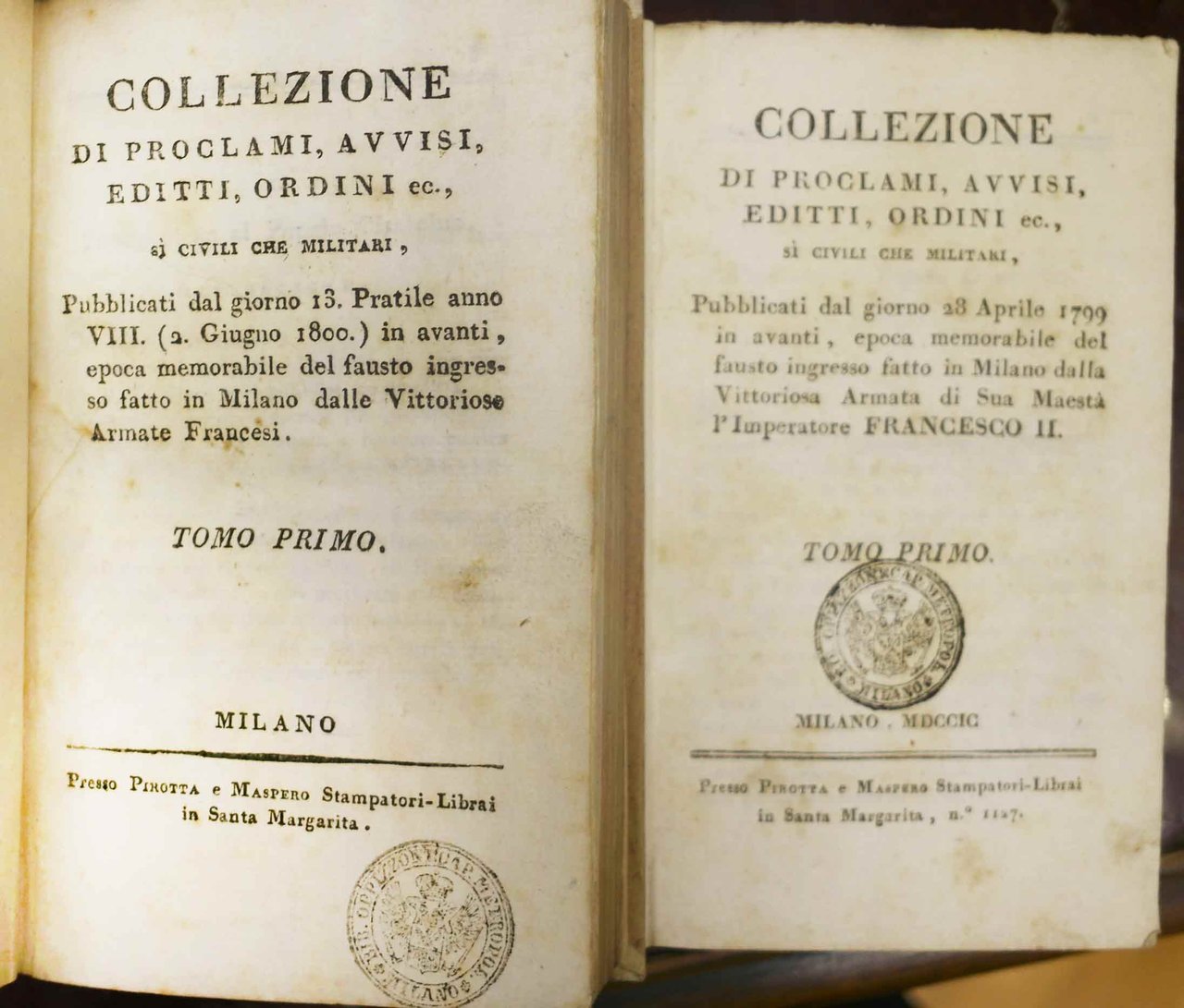 In-16 (mm. 175x100), 15 volumi in 14 tomi, mz. pergamena coeva, tit. stampato su etichetta al dorso. Offriamo una raccolta completa di tutti i bandi emanati dalla città di Milano e dalla Lombardia, a partire dal 28 Aprile 1799 al Febbraio 1802, così composta:- 5 volumi, di ca. 1600 pp. complessive, che raccolgono i proclami, gli avvisi, gli editti, etc. pubblicati dal giorno 28 aprile 1799 in avanti, epoca memorabile del fausto ingresso fatto in Milano dalla vittoriosa Armata di Sua Maestà l'Imperatore Francesco II sino al 2 giugno 1800.- 10 volumi in 9 tomi, di circa 3120 pp. complessive, che raccolgono quelli pubblicati dal giorno 13. Pratile anno VIII. (2. Giugno 1800) in avanti, epoca memorabile del fausto ingresso fatto in Milano dalle vittoriose Armate Francesi.Timbro di apparten. ai frontesp.; alc. carte con uniformi arross., altrimenti esemplare ben conservato.