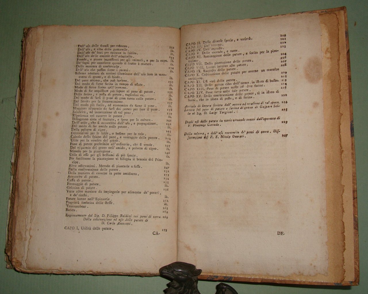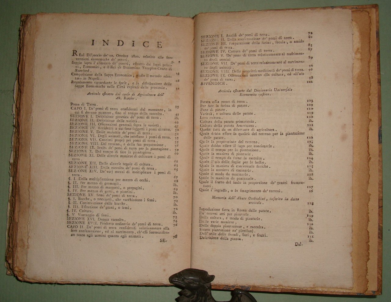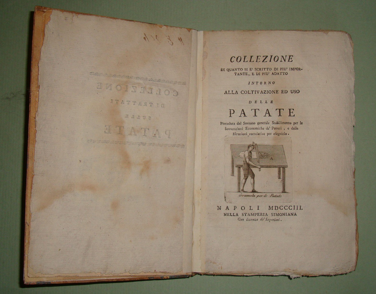 Collezione di quanto si è scritto di più importante, e di più adatto intorno alla coltivazione ed uso delle patate. Preceduta dal sovrano generale stabilimento per le sovvenzioni economiche de' poveri, e dalle istruzioni correlative per eseguirlo. Napoli, nella Stamperia Simoniana, 1803. In 8vo; pp.8n.nn.,267,5n.nn. con indice. Vignetta al frontespizio raffigurante una "Gramola per le Patate". In fine tavola più volte spieghevole raffigurante il "fornello per uso delle Suppe Economiche d'invenzione di D.Giuseppe Morina". Brunit. Cart. post. Dalla dedica a Giovanni Acton: "Offriamo a V.E. nella presente collezione un saggio del nostro zelo nella stimabile commissione addossataci per lo sollievo de' poveri nelle Provincie. Nell'eseguirla è ognun di noi penetrato dal dolce sentimento di contribuire al bene de' suoi simili a sovvenirgli ne' loro bisogni ad indicare i mezzi da ripararli e prevenirli per lo avvenire. Queste idee ci han risvegliato il pensiero di riunire insieme per lo comodo generale ciò che di più interessante è stato sparsamente scritto intorno agli usi, vantaggi, e coltivazione delle patate. Ha ciò per oggetto il familiarizzare nel Regno le cognizioni di un ramo di agricoltura tendente ad una risorta di abbondanza per tutt'i tempi. L'esempio della Irlanda e della Francia salvate dalla penuria in due diversi rincontri col mezzo delle patate: le scoverte fatte e intorno alla salubrità di questo prodotto, ed alla molteplicità dei suoi usi per gli oggetti di sussistenza e di economia: le applicazioni fattene per lo più sano e meno dispendioso alimento de' poveri e per la nutrizione di ogni specie di animali domestici a noi preziosi". Rara raccolta di opere riguardanti le patate: La composizione della suppa economica giunta il metodo adottato in Napoli; Il pomo di terra, articolo estratto dal corso di agricoltura dell'Abate Rozier; Articolo estratto dal Dizionario Universale Economico stampato in Roma nel 1795: farina di patate, pane di patate, il tempo per la piantazione, il modo di cucinarle; Memoria dell'Abate Occhiolini: l'introduzione fatta in Roma delle patate, esperienza nel cuocere le patate; Ragionamento del Sig. Filippo Bandini sui pomi di terra; Della coltivazione ed uso delle patate di Carlo Amoretti; Lettera sul pane di patate e farina di grano di Gaspare Sella. In fine il trattato di Vincenzo Corrado: "Degli usi delle patate in varie vivande". Niccoli, pag.227.