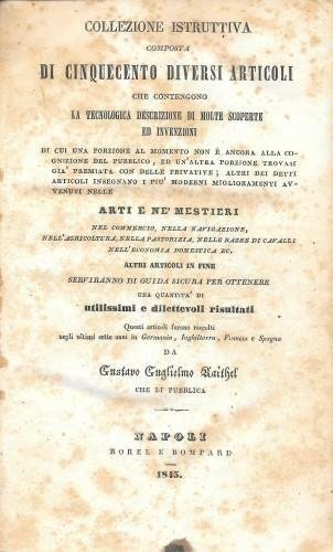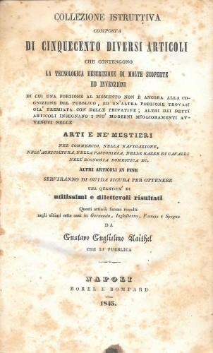 Collezione istruttiva composta di cinquecento diversi articoli che contengono la tecnologica descrizione di molte scoperte ed invenzioni. avvenuti nelle arti e ne' mestieri, nel commercio, nella navigazione nell'agricoltura, nella pastorizia, nelle razze di cavalli, nell'economia domestica ec.