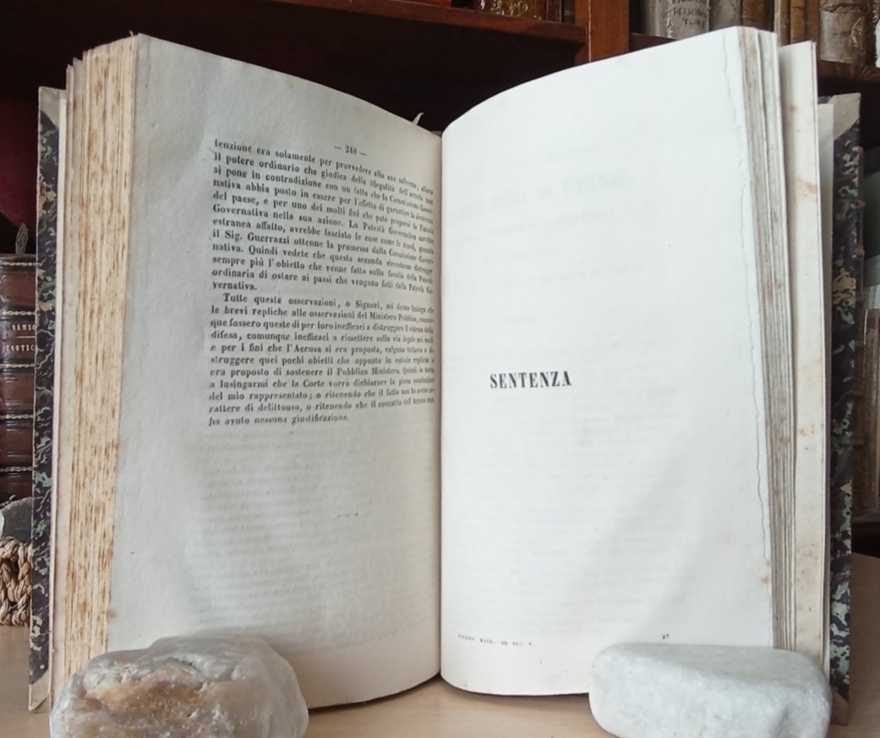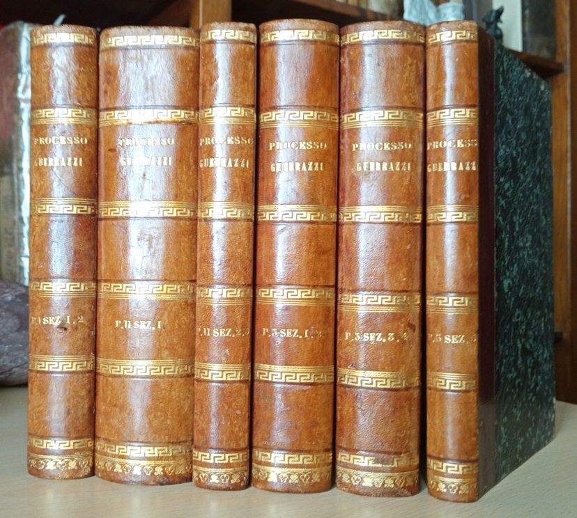 Dieci sezioni in sei volumi in 8 grande, elegante legatura coeva in mezza pelle, titolo ai dorsi ornati in oro, sguardie, frontespizi, 459, 95, 888, 123, VIII, 313, 250, 407, 343, 348, 339 pp., carta di errata, 9 tavole ft. con ritratti litografici. Resoconto assolutamente esaustivo del processo per lesa maest subito da un manipolo di patrioti toscani fra cui giganteggiano il Montanelli ed il Guerrazzi. Di eccezionale valore documentaristico e storico, altres d'interesse giuridico per lo studioso. Raro a reperirsi sul mercato antiquario, qui presentato in pi che bello stato, poche ed insignificanti mende d'uso. Importante.
