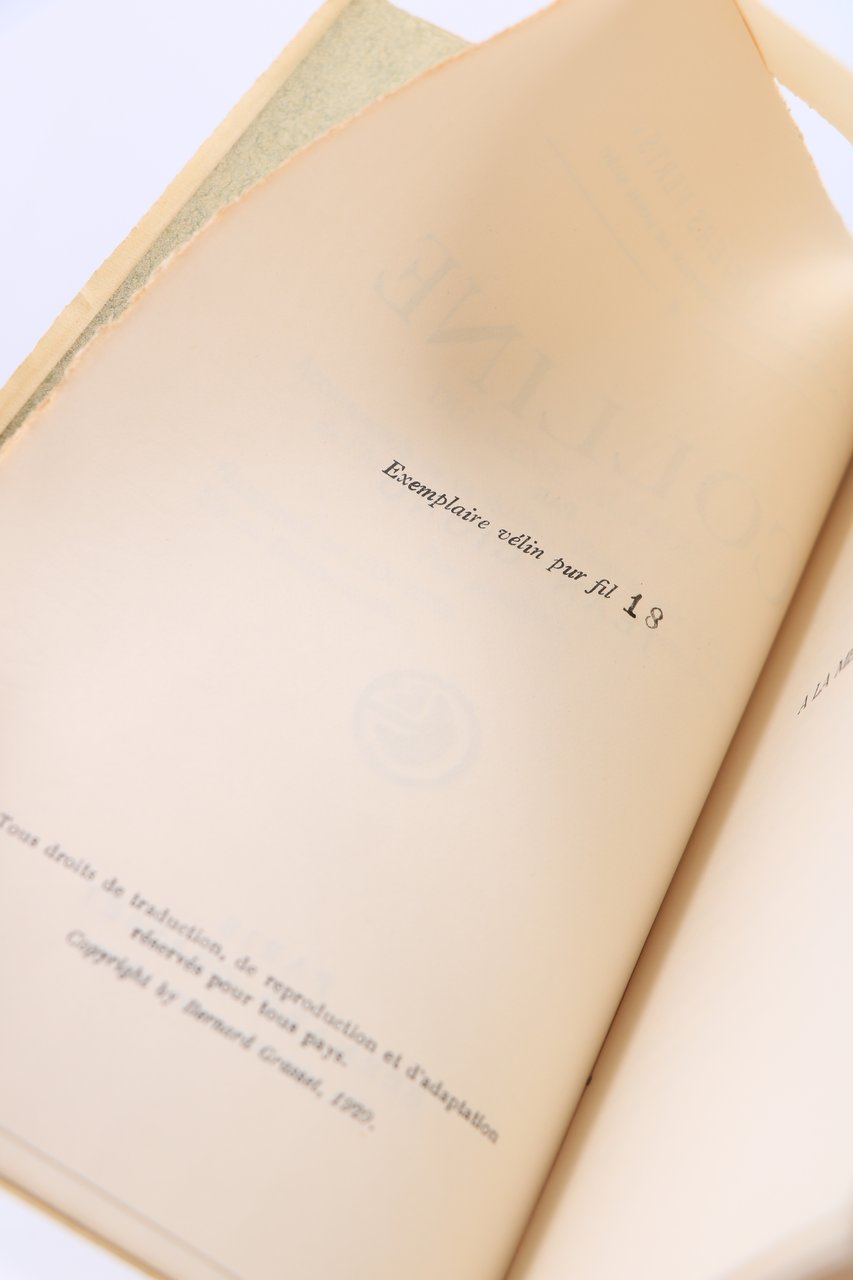 Grasset | Paris 1929 | 12 x 19 cm | Broché | First edition, one of 170 numbered copies on pure rag paper. Shadowed endpapers; a small loss at the head of the upper board of the original front cover. A pleasant copy, preserved in its double wrapper. * [FRENCH VERSION FOLLOWS] | Edition originale, un des 170 exemplaires numérotés sur pur fil. Gardes ombrées, un petit manque en tête du premier plat de la première couverture. Agréable exemplaire sous double couverture.