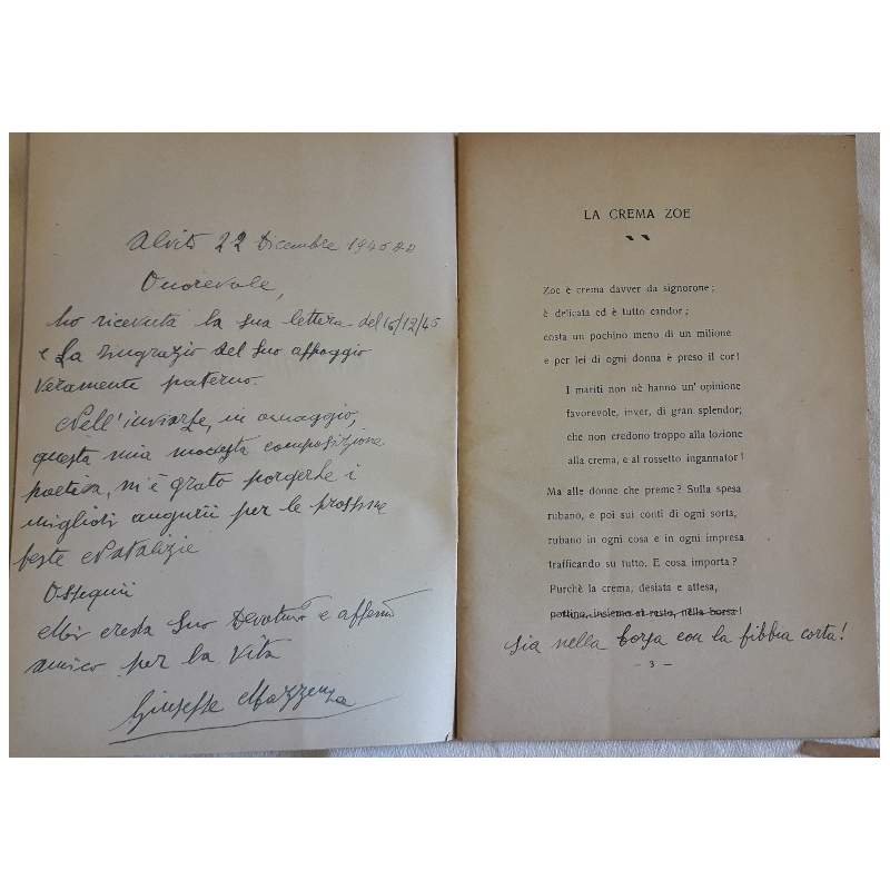 In 8', br. ed. a punta di spillo, pp. 102, ampia dedica in prima pagina dell'A. e piccola correzione di un verso(foto); segni d'uso, gore e piga alla cop.,interno in buono stato, leggermente brunito. ***Due to bureaucratic reasons, books dated over 70 years old cannot be immediately exported, please contact us before placing the order.***