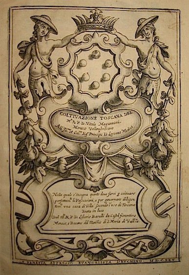 4to (cm. 22,4), 8 cc.nn. (compreso bellissimo frontis. interamente inciso da F.Valesio), 136 pp., 8 cc.nn. Fregi, finalini e capilettera ornati; una xilografia a piena pagina n.t. (raffigurazione dei venti). Legatura ‘800 in mz. pergamena con titolo ms. al ds. Piatto anteriore leggermente increspato e piccola mancanza di carta al piatto posteriore. Fresco esemplare a grandi margini. Ottimo stato di conservazione, salvo un chiaro alone violaceo sulle ultime venti carte (più evidente sulle ultime dieci). Prima rara edizione. Quest’opera, dedicata al principe Lorenzo Medici, costituisce un prezioso documento per la storia agraria della Toscana come scrisse Filippo Re - citato sia dal Gamba (n.1988) che dal Pescarzoli (n. 1800). Lo stesso Re, inoltre, annota riferendosi proprio al lavoro del Magazzini come le patate fossero conosciute a Firenze ‘prima del tempo in cui, secondo altri, vuolsi fossero coltivate in Italia. Furono colà trasportate dalla Spagna e dal Portogallo col mezzo dei Padri Carmelitani scalzi’. Moreni (II, p. 9) descrive la ristampa del 1634 e cita in nota questa prima.