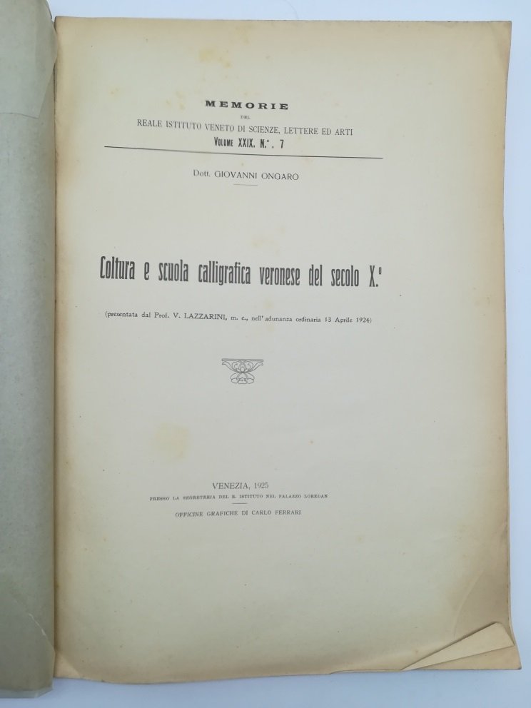 In 4 (cm 24,5 x 33), pp. 91 + (1 bianca) con 3 tavole finali con riproduzioni fotografiche. Pagine intonse. Brossura editoriale. Estratto editoriale dalle 'Memorie del Reale Istituto Veneto di scienze, lettere ed arti'.