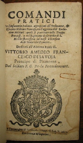 Comandi pratici per l’infanteria italiana, appropriati all’ordinanze & esercitio militare francesi, con l’aggionta dell’Evolutioni militari. dedicati all’Altrezza Reale di Vittorio Amedeo Francesco di Savoia Prencipe di Piemonte dal Soldato F.G. De-la-Ferteodencourt (segue con proprio frontespizio) Les evolutions militaires, que S.M. Tres-Chrestiénne fait exercer au Regiment des ses Gardes Françoises, descrites par plusieurs Capitaines, & Commandants François