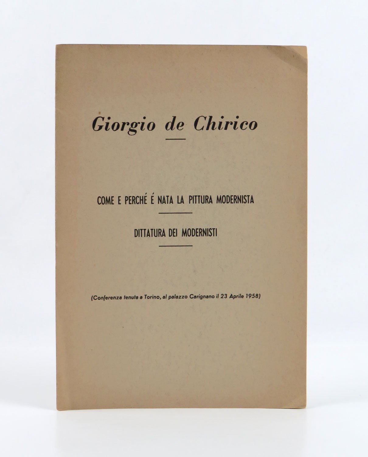 LIBROEdizione originale.Ottimo esemplare (normale uniforme brunitura delle carte).Rarissimo opuscolo che riporta il testo della nota conferenza “antimodernista” di De Chirico. Un solo esemplare in ICCU (BNC Roma), cui OCLC aggiunge una sola altra copia, sempre a Roma, alla Biblioteca Hertziana. Fu un momento topico per le vicende artistiche dell’Italia del secondo Novecento, come ricostruito in un recente libri di Andrea Cortellessa, «Giulio Paolini, Giorgio De Chirico: un appuntamento mancato» (Torino 2019): «È il 23 aprile 1958, a Torino, Palazzo Carignano, Giorgio de Chirico tiene una conferenza piena di polemiche invettive contro la “dittatura dei modernisti”. Ad ascoltarlo c’è un Giulio Paolini diciassettenne. Il futuro esponente dell’Arte povera si indigna, ma poi ispirerà ogni suo gesto nell’arte al senso di enigma e attesa delle opere del grande metafisico, direttamente e devotamente omaggiato anche con decine di collage in forma d’après. [.] le parole dette da de Chirico quella sera a Torino [furono] punto di congiunzione astronomica fra due dei massimi artisti della nostra modernità, che la modernità congiuntamente hanno messo a morte».