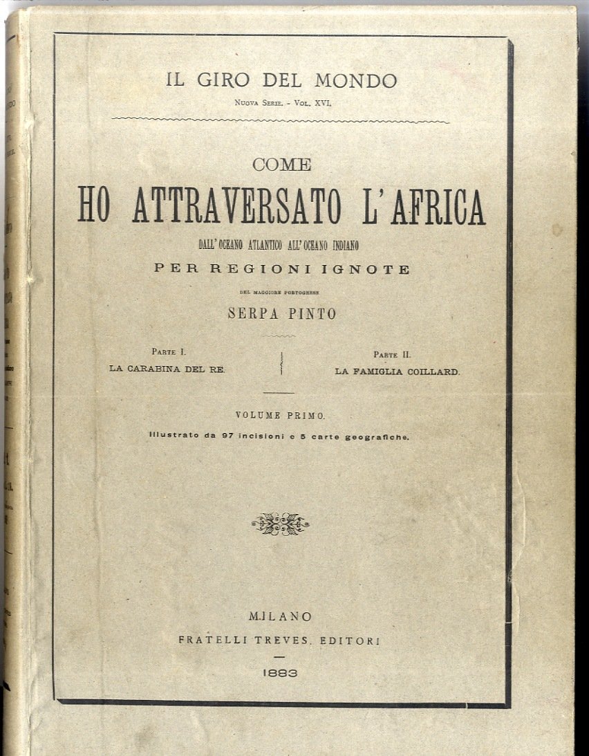 >Due volumi in-4, pp. XVI + 270; (4) + 236 con centinaia di illustrazioni n. t. Legatura editoriale in cartone. Prima edizione italiana (pubblicata nella prestigiosa collana IL GIRO DEL MONDO)di questa importante esplorazione Portoghese. Questo ufficiale nel 1877, venne posto al comando di una spedizione che doveva unire le colonie dell'Angola e del Monzambico e, dopo un lungo silenzio, comunico' di essere giunto a Pretoria attraversando il Continente Nero. Ilviaggio che parti' da Luanda e attraverso Benguela raggiunse Pretoria, chiari' molti dubbi riguardo ai bacini e al corso dello Zambesi e del Cubango. Ottimo stato. Zavatti, Diz. esploratori, p. 259.