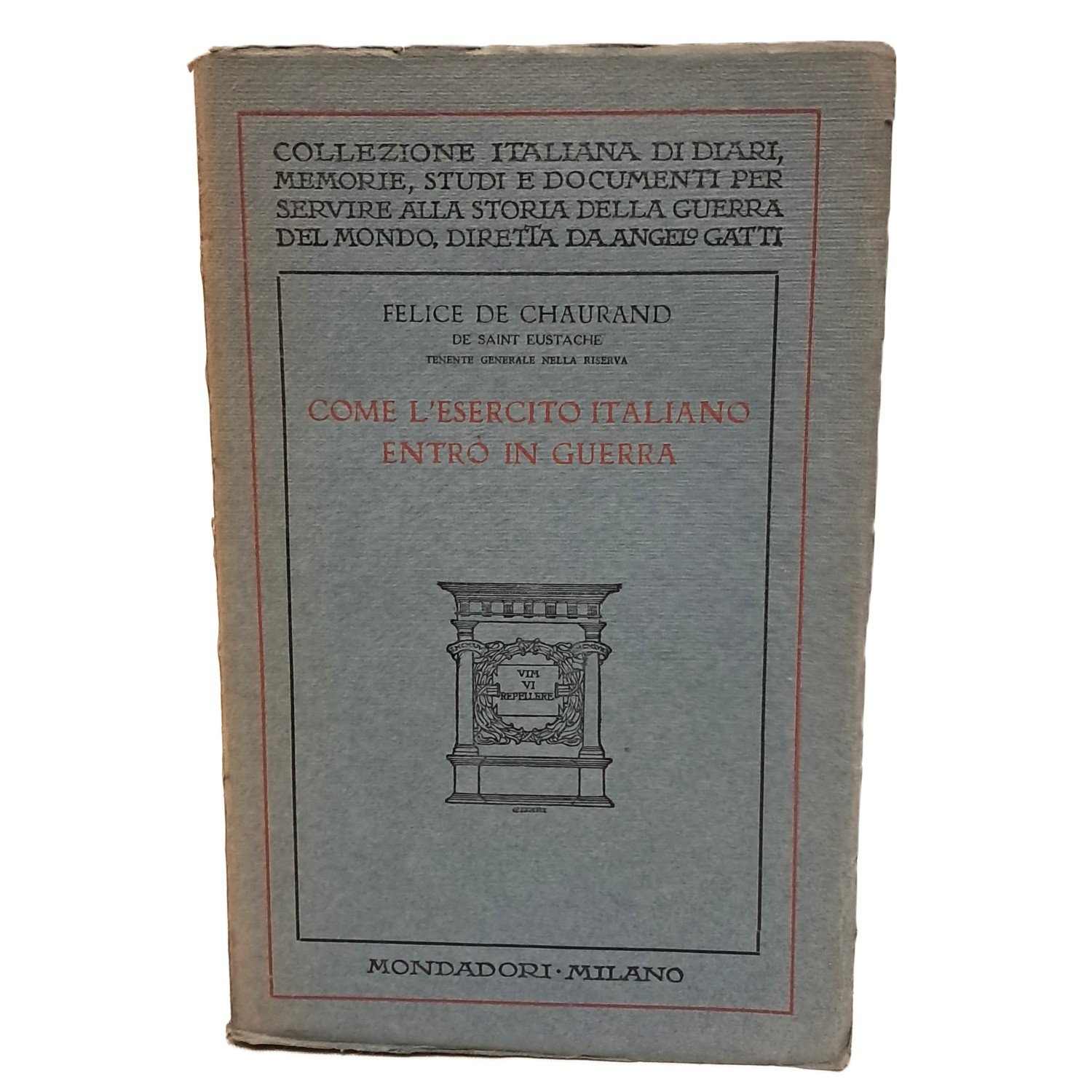 PRIMA EDIZIONE nella Collezione italiana diretta da Angelo Gatti di diari, memorie, studi e documenti per servire alla storia della guerra del mondo  Trattato sulle condizioni generali dell'esercito italiano al momento di entrare in guerra redatto dal responsabile della riserva. In brossura con copertina di Cisari. Pp. 366. Buone condizioni.