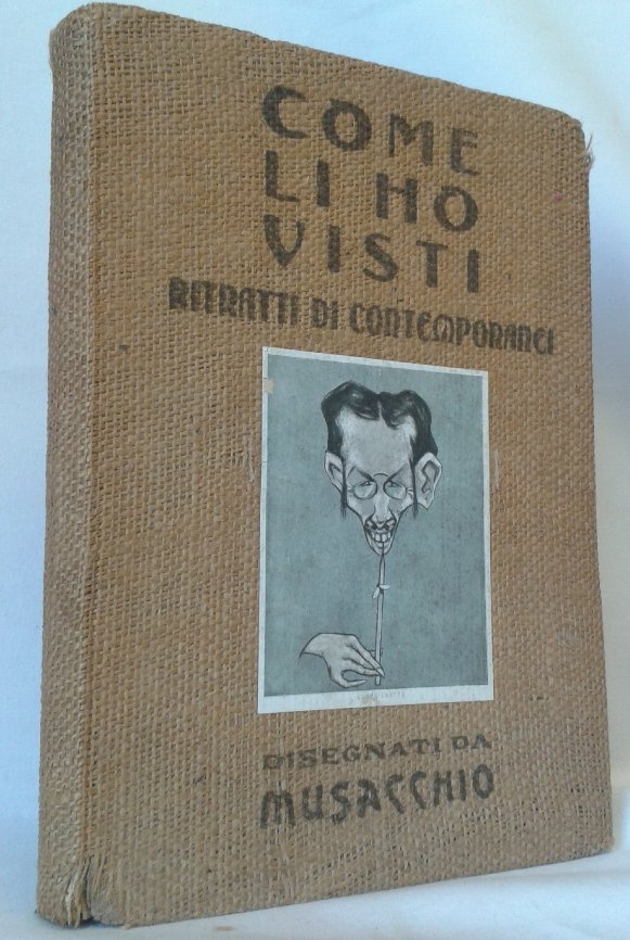 Volume in 4 piccolo, tela editoriale stampata con vignetta in carta incollata, titolo al piatto, sguardie, frontespizio inquadrato, tre carte, CIII carte numerate con altrettante caricature, 2 carte d'indici, bianca finale. Eccezionale capacit interpretativa, finezza di tratto e perspicace intuizione quanto evince da questa serie di pregevolissimi lavori. Quando la matita capace si mette al servizio della satira non si pu essere delusi. Fra i 'ritratti' (che al piede hanno una breve notula esplicativa del soggetto ripreso) si voglion citare Leonida Bissolati, Claude Debussy, Enrico De Nicola, Di Giacomo, Facta, Gea Garisenda, Giolitti, Leoncavallo, Marconi, Marinetti, Mascagni e gi gi fino a Zandonai, con 'partecipazioni' notevoli di personalit staniere. Eccezionale l'opera, eccellente la conservazione, notevolmente poco comune.