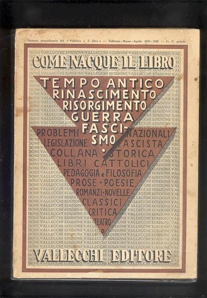 IN 8 gr.( cm.26,5 X 19,5 ), pp.476, INDICE. COPERTINA EDITORIALE ILLUSTRATA CON TITOLO ENTRO CORNICE. VOLUME RICCAMENTE ILLUSTRATO in b/n. IN ANTIPORTA, RITRATTO DEL DUCE CON LIBRO E MOSCHETTO. CENNI BIBLIOGRAFICI SULLE PIU' IMPORTANTI EDIZIONI<BR>STAMPATE DA VALLECCHI SU : TEMPO ANTICO, RINASCIMENTO, RISORGIMENTO, GUERRA, FASCISMO. NUMERO STRAORDINARIO DEL " PUBBLICO E IL LIBRO " - FEBBRAIO / MARZO /<BR>APRILE 1935 - XIII. MINIMA MANCANZA IN ALTO NELLA PARTE ESTERNA DELLA PRIMA DI COPERTINA E MINIME SPELLATURE AL PIEDE E ALLA TESTA DEL DORSO, ALTRIMENTI OTTIMA CONSERVAZIONE GENERALE. ID, 4391