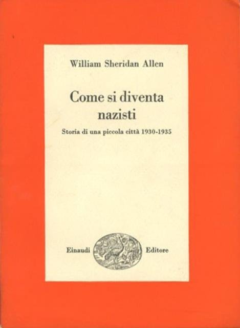 309 p. ; 21 x16 cm. Saggi. Questa è la storia di una piccola città della Germania durante gli anni della Repubblica di Weimar e i primi anni del Terzo Reich; ed è al contempo un tentativo di comprendere come una democrazia civile sia potuta precipitare e affondare in una dittatura. Thalburg (in realtà Nordheim) è un tranquillo centro dell'antico regno dello Hannover, diecimila abitanti, molto commercio e poche industrie, che tra il 1930 e il 1935, come tutta la Germania, cambia volto: sulla base di una vasta documentazione e di una paziente indagine personale, lo studioso americano Allen racconta con la vivacità e la passione di un cronista le tappe di quella tragica trasformazione, dando un'identità precisa a fatti e persone che hanno legato il loro destino alle sorti dell'intero popolo tedesco. «La distruzione di una comunità politica, la fine della democrazia è sempre possibile - e oggi come allora gli avversari della democrazia stanno anche dentro di noi, nel perenne conflitto, ch'è a un tempo sociale e psichico, tra bisogno di sicurezza e desiderio di libertà». (Luciano Gallino). . Brossura editoriale, coperta in cartoncino flessibile colorato (arancione e b/n), manca la sovraccoperta editoriale, per il resto esemplare integro. Codice libreria 530.