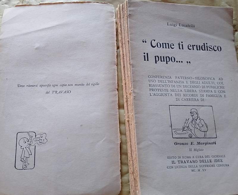 In 8', br. ed., pp. 211(5)fig. in n. n.t.; conferenza paterno-filosofica ad uso dell'infanzia e degli adulti, col riassunto di un decennio di pubbliche proteste nella libera stampa e con l'aggiunta dei ricordi di famiglia e di carriera di Oronzo E. Marginati. esemplare sciolto(foto), piatto post. mancante , segni d'uso e del tempo, modesto . ***Due to bureaucratic reasons, books dated over 70 years old cannot be immediately exported, please contact us before placing the order.***