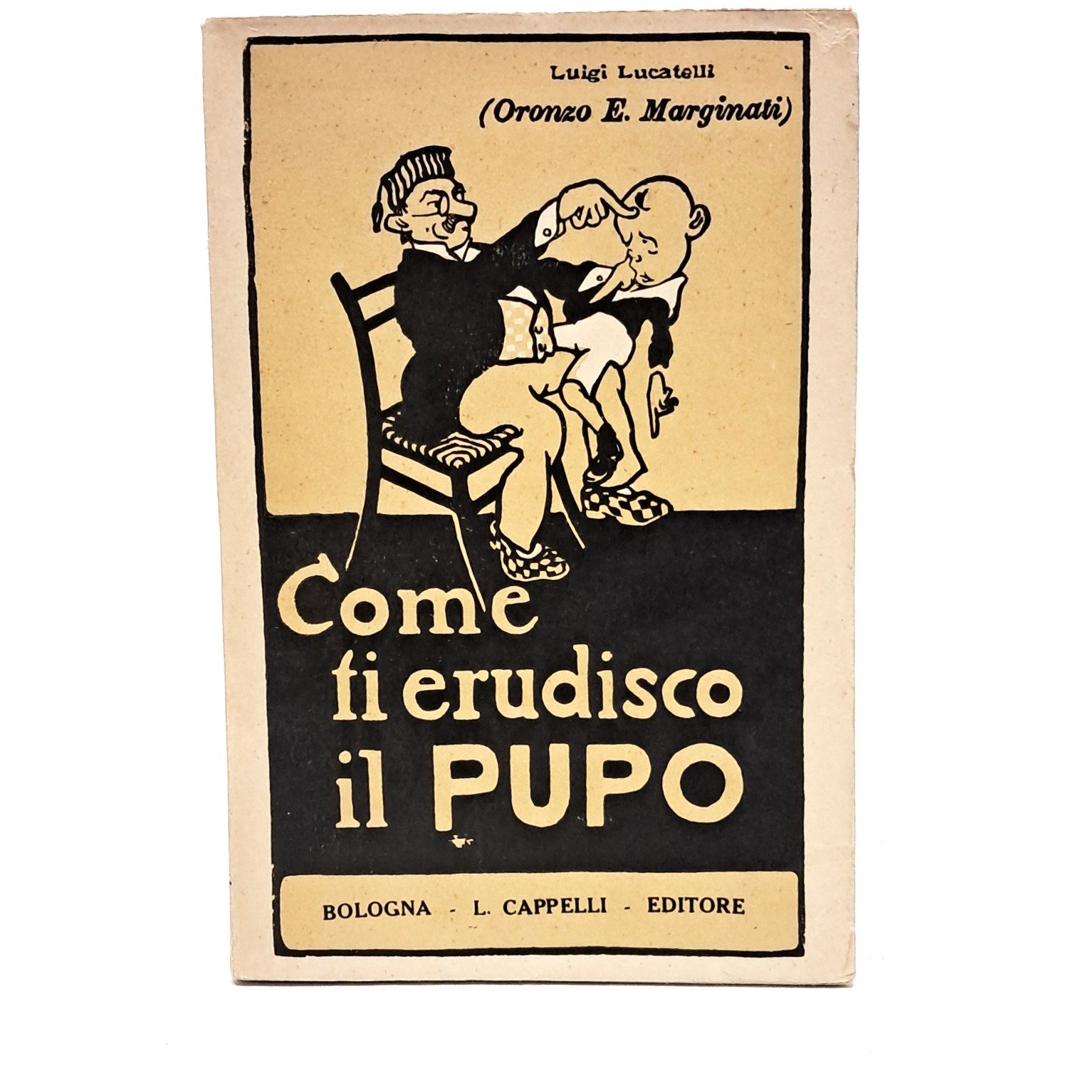 Ristampa. Conferenza paterno-filosofica ad uso dell'infanzia e degli adulti, col riassunto di un decennio di pubbliche proteste nella libera stampa e con l'aggiunta dei ricordi di famiglia e di carriera di Oronzo E. Marginati Oronzo (pseudonimo di Lucatelli Luigi) è fiero di essere un uomo qualunque e si scaglia contro tutti i superomisti, i Futuristi e soprattutto contro D’Annunzio che detesta perché idolatrato da Teresina, pericolosamente incline a diventare superdonna per amore del Vate. Oronzo, da parte sua, cerca in ogni modo di migliorarsi con qualche incursione temeraria nel mondo della cultura e, soprattutto, perfezionando il suo eloquio. Il suo sforzo di ripulire la parlata romanesca natia produce una ridicola lingua ibrida che è fonte di ilarità per il lettore di ogni parte d’Italia. In politica Oronzo è appunto un uomo qualunque che oggi diremmo di destra moderata. È patriottico, rispettoso della legge, stranamente ama Garibaldi che considera un vero uomo qualunque coraggioso e senza peli sulla lingua, teme i guerrafondai come il Kaiser Guglielmo e i sindacalisti perché li ritiene dediti soltanto ai propri interessi e non a quelli del proletariato. Il proletariato è il suo incubo perché è una condizione nella quale teme di sprofondare un giorno o l’altro. Dal blog di Fulvio Scaparro In brossura con molti disegni nel testo di Scarpelli, Finozzi e Guasta. Pp. 228. Ottime condizioni.