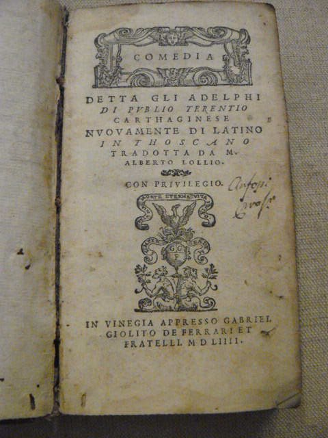 Comedia detta gli Adelphi di Publio Terentio Carthaginese nuovamente di latino in thoscano tradotta da Alberto Lollio. Venezia, Giolito, 1554segue: Egloghe D'Andrea Lori, a imitation di Vergilio al sig. Abate Rucellai. Venezia, Giolito, 1554. segue:Due comedie di Lorenzo Comparini Fiorentino. Cioè il pellegrino et il ladro, nuovamente uscite in luce. Venezia, Giolito, 1554;