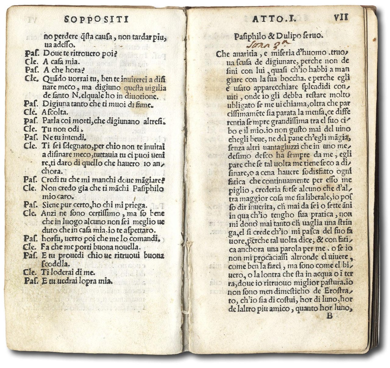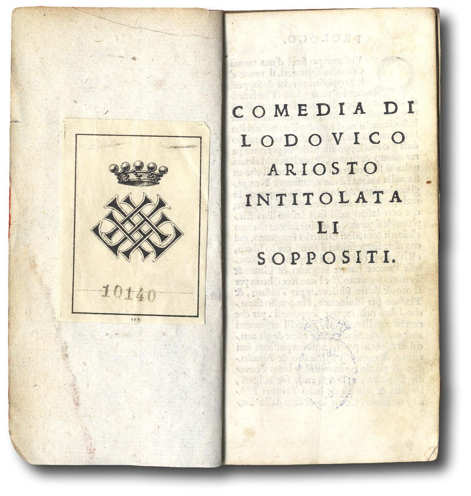 >in-12, ( 130x68 mm), ff. XXXX, copertina di carta settec. marmorizz. Rarissima terza edizione de ''I Suppositi'', cinque atti in prosa (quella ''riformata et ridotta in versi'' apparirà presso Giolito nel 1551), ''assai rara, citata dalla maggior parte delle bibliografie, ma di rado descritta, e inesattamente'' (cfr. Agnelli-Ravegnani II, p. 96). Lo stesso bibliografo afferma che ''pur seguendo cronologicamente l'editio princeps (impressa a Ferrara, senza note tipogr.), questa stampa di Roma non può dirsi con certezza la seconda edizione dei Suppositi in prosa, inquantoché senza dubbio è esistita una stampa di Siena del 1523, ricordata dal Mazzuchelli, dal Gamba, dal Polidori''. Per l'identicità delle caratteristiche tipografiche (caratteri, frontespizio, formato) può essere considerata ''gemella'' della ''Cassaria'' in prosa del 1525 (Roma, s.n.t., in-12) e, come quella, è da attribuirsi all'officina tipografica del Mazzocco (op. cit., pp. 83 e 96); c'è da notare, però, che lo STC (Italian Books, p. 38) e ICCU (A-2509) l'attribuiscono allo stampatore Francesco Minizio Calvo. Composta nel 1508 e rappressentata nel febbraio del 1509, la comedia è fondata tutta sopra sostituzioni di persone e sopra equivoci, a imitazione dell'Eunuco di Terenzio e dei Captivi di Plauto. Di notevole importanza letteraria tra le cinque commedie scritte dall'A., la presente ispirò Shakespeare per la sua pièce ''Taming of the shrew'' che la conobbe nella traduzione inglese pubblicata nel 1566. Esempl. puro e genuino di questo gioiellino bibliografico, con antica nota ms. alla fine del prologo e numerazione ms. delle varie scene (ex-libris barone Landau). Allacci 745. ICCU A-2509 (12 esempl.). Graesse I, 203.