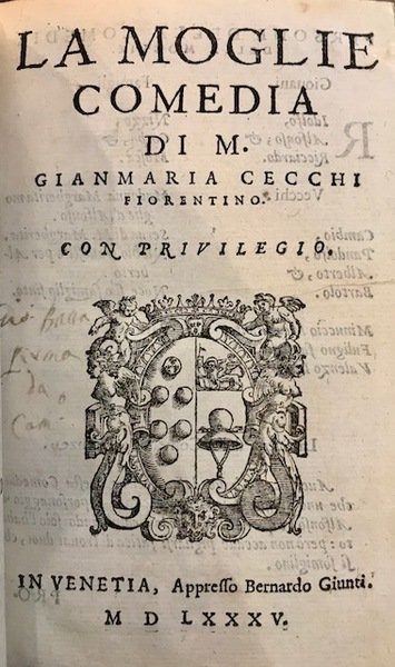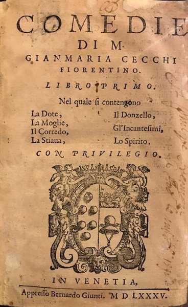 Comedie di M. Gianmaria Cecchi fiorentino. Libro primo. Nel quale si contengono La Dote, La Moglie, Il Corredo, La Stiava, Il Donzello, Gl’Incantesimi, Lo Spirito