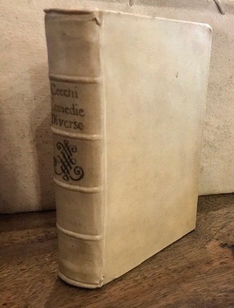 8vo (cm. 15), 4 cc.nn., 40 cc.; 40 cc.; 41 cc.; 31 cc.; 43 cc.; 31 cc.; 35 cc. Ciascuna commedia, salvo la prima, con proprio frontespizio con marca tipografica (stemma Medici-Cappello: sei palle, leone, cappello). Iniziali e fregi xilografici. Legatura ‘700 in pergamena rigida con nervi, fregio e titolo ms. al ds. Tagli azzurri. Antica scritta di appartenenza, sbiadita, al frontespizio. Restauri nella parte superiore delle prime quattro carte. Margine esterno della carta di Dedica rifilato con perdita di alcune lettere di testo. Pagine iniziali leggermente brunite. Salvo i difetti segnalati, esemplare assai fresco ed in ottimo stato di conservazione. Edizione originale. A questo primo Libro di commedie in versi, nonostante le intenzioni del Cecchi, non ne seguirono altri. Allacci, 265-534-220-739-263-443-735. Chiesa, ‘Teatro italiano del cinquecento’, n. 51.
