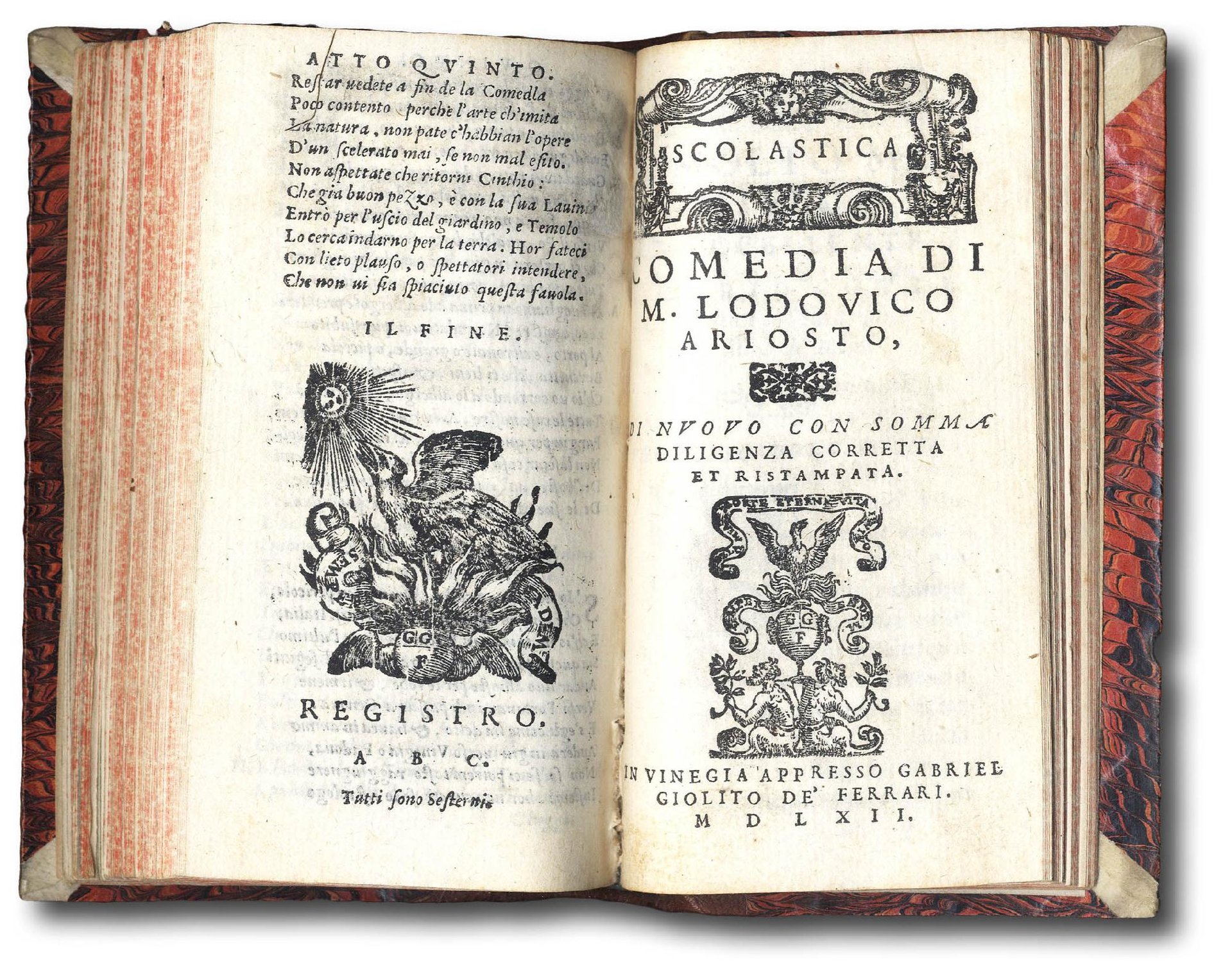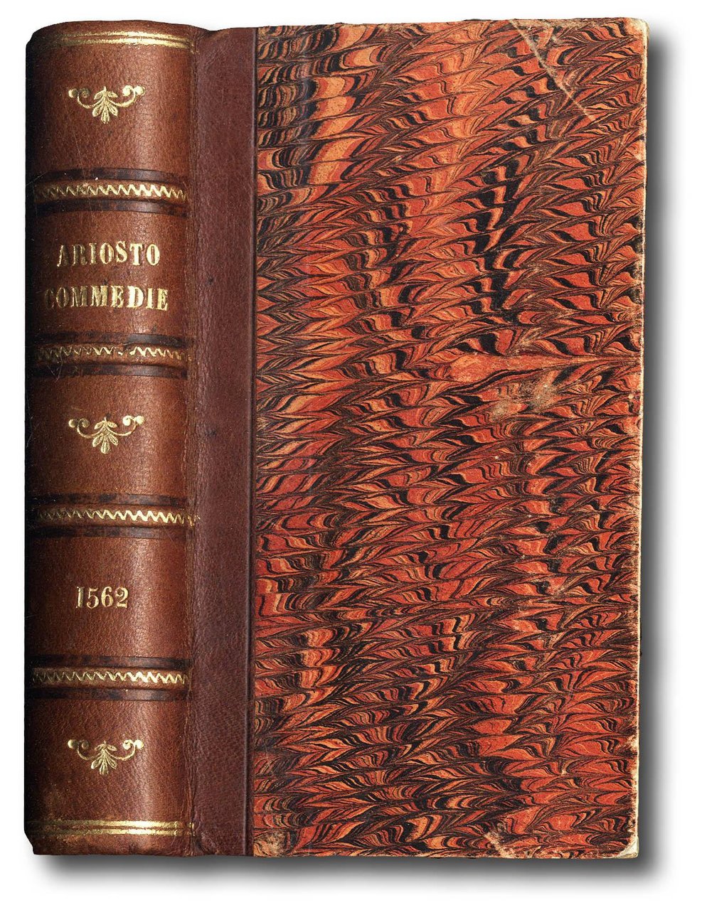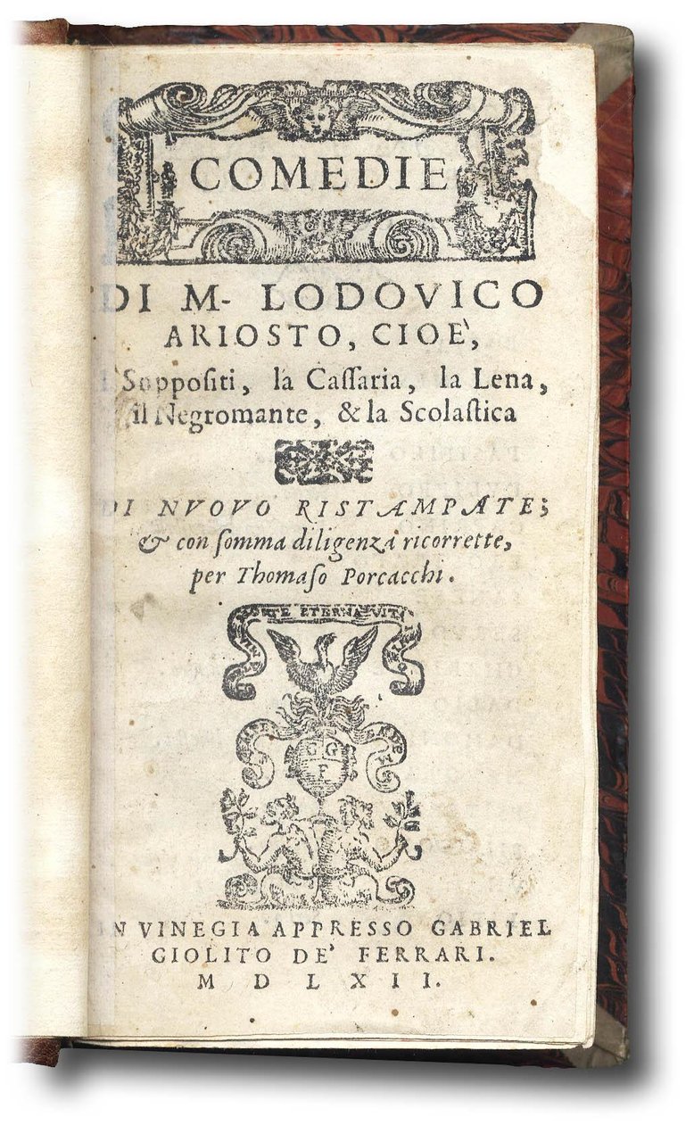 >5 opere in 1 vol. in-12 (130x80 mm), ff. 41, (1 bianco mancante), 54, 30, 36, 48, leg. ottocentesca in mezza pelle, tit. e fregi oro al dorso a nervi. In testa al volume frontespizio generale, che serve anche per i Suppositi; le restanti 4 commedie hanno front. e paginazioni proprie; su tutti, eccetto che per la Cassaria, datata 1560, compare la data 1562. Imprese dello stampatore in principio e in fine delle varie commedie. Prima edizione collettiva delle commedie ariostee; nel 1551 uscirono infatti, in libretti separati presso Giolito, solo 3 delle 5 commedie, mentre la Cassaria fu stampata per la prima volta nel 1560 e la Scolastica nel 1553. Pregevole edizione curata dal Porcacchi e dedicata a Severino Ciceri (la Scolastica è invece dedicata a Mario Cotti). Buon esempl. (piccoli restauri nei margini del primo foglio). Graesse I, p. 204. Brunet I, p. 447. Bongi II, p. 142-143. Agnelli Ravegnani II, p. 79-80. Gamba n. 78