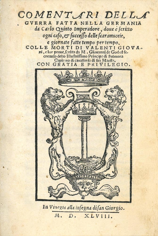 Prima edizione.Ottimo esemplare, freschissimo e completo dell’ultima carta bianca.Giovanni de Godoy fu segretario di Filippo di Lannoy, principe di Sulmona e marito di Isabella Colonna, il cui stemma compare al frontespizio. L'opera, suddivisa in due libri, riporta le vicende della guerra che vide opporsi Carlo V ai principi luterani tra 1546 e 1547.Cfr. Adams, I, 809.