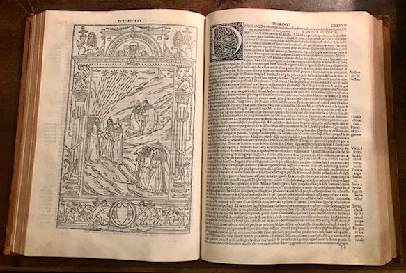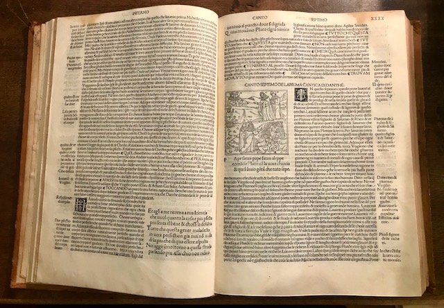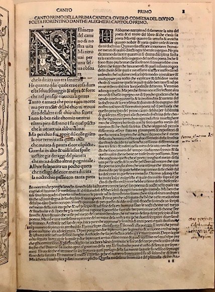 Folio (cm. 29,5), 291 cc., 1 c.nn. Con quattro illustrazioni a piena pagina (di cui una ripetuta) e 97 altre piccole incisioni xilografiche all’inizio di ciascun canto. Carattere tondo più minuto per il Commento e più grande per i versi. Legatura settecentesca in vitellino nocciola con nervi, fili e titolo oro su tassello nero al ds. (minime tracce di restauro alle cuffie). Tagli rossi. Interni molto freschi ed in ottime condizioni generali, salvo minime ingialliture e qualche piccola macchia. Sottolineature ed annotazioni ad opera di una stessa mano cinquecentesca sulle carte iniziali. Il nostro esemplare presenta le seguenti caratteristiche: 1. Assenza, come di frequente, del primo fascicolo di dieci carte (Vita di Dante e altri scritti presenti nel Prologo del Landino). 2. Prima carta al cui verso è presente la seguente annotazione assai curiosa di mano antica: ‘Trentaquattro canti Inferno trentatre canti Purgatorio trentatre canti Paradiso. Letti tutti tre li canti tutti: judico la Inventione di Dante essere stata veramente bellissima, ma li suoi versi in maggior parte da pigliarne poco piacere rispetto alli altri migliori scrittori come petrarcha, Luigi Pulci, morgante, & ultimamente el furioso per lo suo dir franco e scabroso e rozo come ho notato nel canto XX dell’Inferno: ibi: se dio ti lassi lettor prender frutto’. Prima edizione interamente figurata della Commedia dantesca: un ciclo di xilografie del tutto nuovo accompagna le tre Cantiche ed illustra per la prima volta anche il Paradiso (la precedente edizione bresciana del 1487 presentava infatti soltanto 68 illustrazioni). Cfr. Mambelli, ‘Gli annali delle edizioni dantesche’, n. 13; Olschki (Le livre illustré au XV° Siècle) n. 165; Goff, D32; Essling, 531; Sander, 2313.