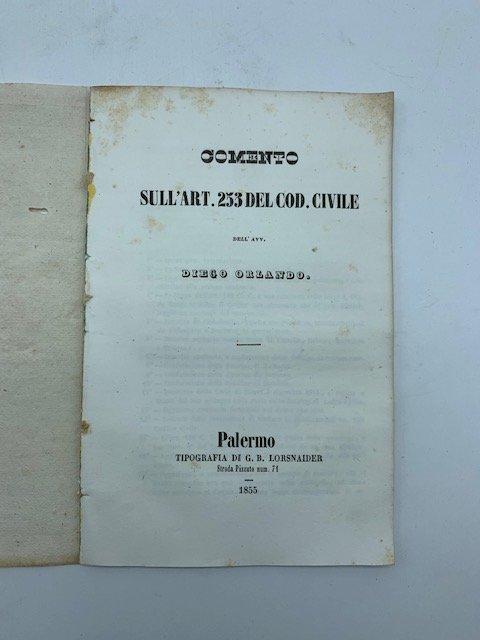 In 16 (cm 12 x 19), pp. 58. Brossura rifatta con carta d'epoca. Commento sull'articolo 253 del Codice Civile: "I figli nati fuori dal matrimonio, eccetto gli incestuosi e gli adulterini, s'intendono ipso jure legittimati mediante il susseguente matrimonio delle loro madri coi loro padri quando costoro li avranno legalmente riconosciuti per figli prima del loro matrimonio ".