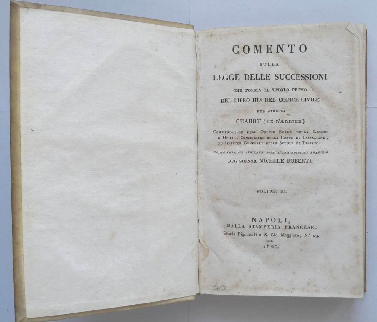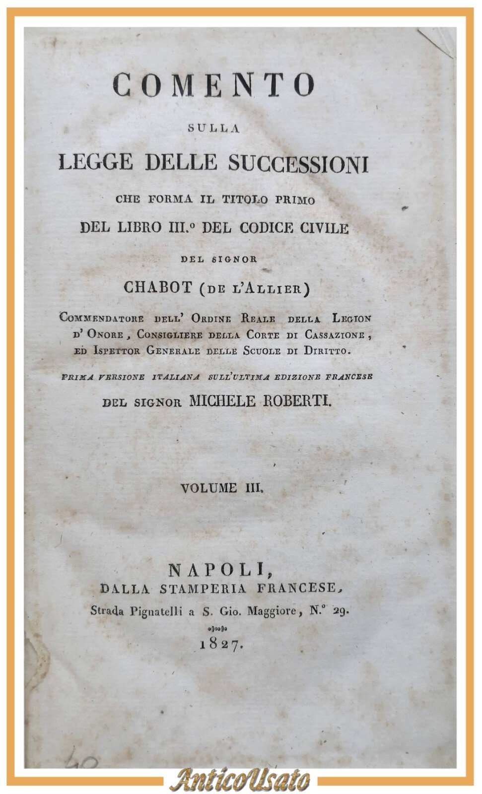 COMENTO SULLA LEGGE DELLE SUCCESSIONI di Chabot Volume 3 e 4 1827 Libro antico