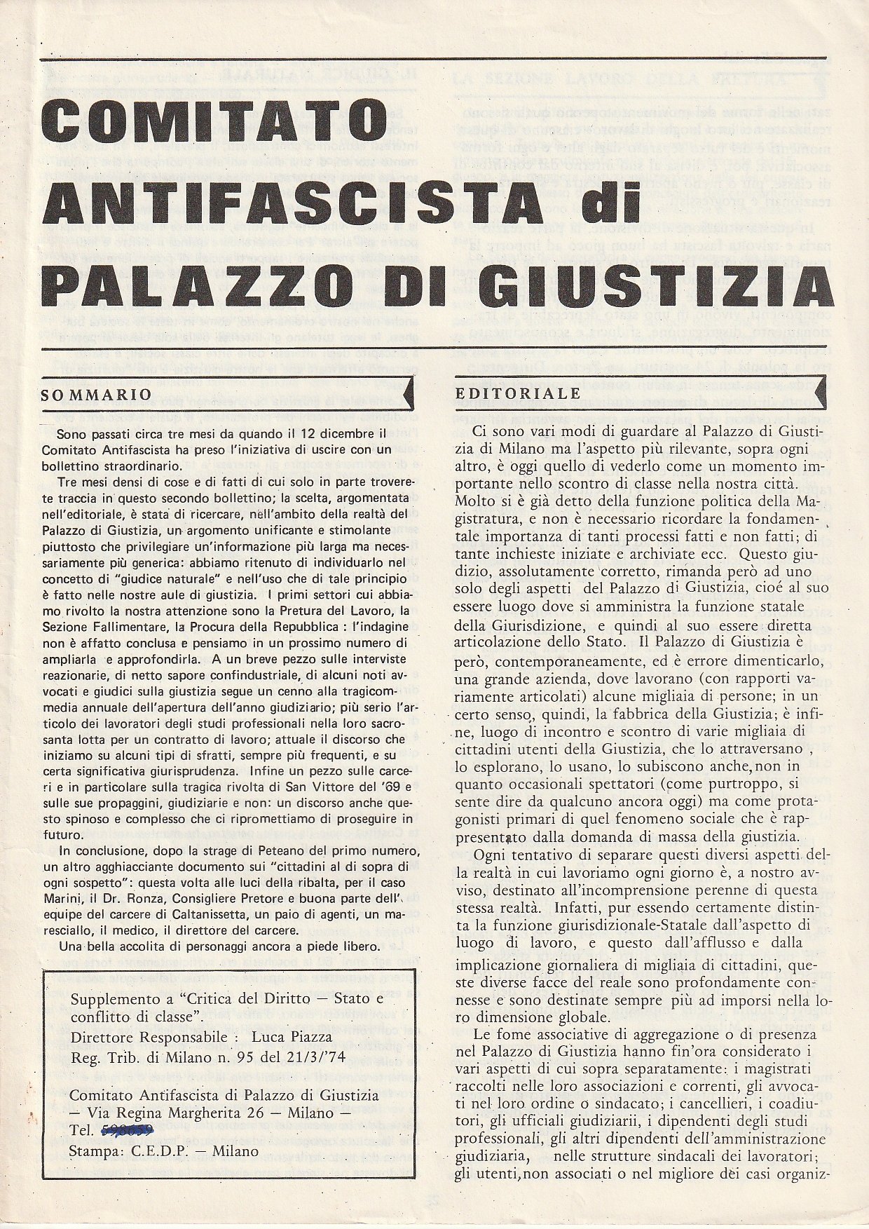 Fascicolo a fogli sciolti, esce come supplemento a "Critica del Diritto - Stato e conflitto di classe", testo su due colonne, in ottimo stato