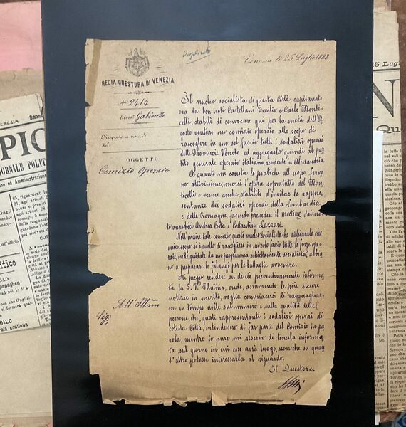 Foglio manoscritto originale, su carta intestata a firma del questore di Venezia, in data 25 luglio 1888, riguardante le attività del nucleo socialista cittadino in vista del comizio dell’agosto d3llo stesso anno, 28x19 cm, strappetti e mancanze ai margini, conservato in cornice a giorno per la delicatezza della carta.