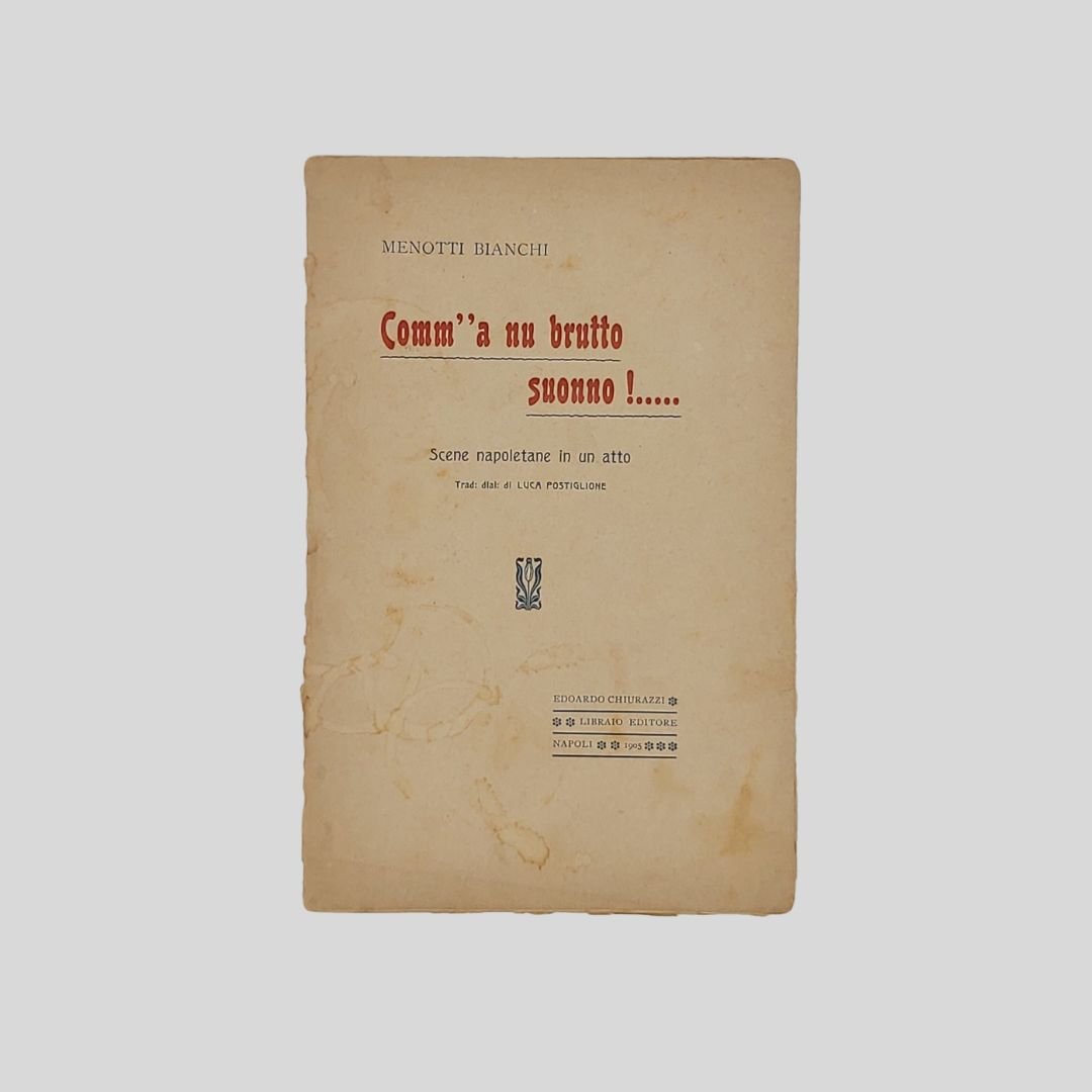 in-16 (cm 19), pp. 21-2 (cat. teatrale). Tracce d’uso. Menotti Bianchi [Napoli 1868-1937?] Autore dialettale molto stimato da attori e attrici (Adelina Magnetti, Luigi Galloro, Marietta Del Giudice), da commediografi, critici e scrittori come Roberto Bracco, Luigi Capuana. Giovanni Verga, Achille Torelli, Giannino Antona-Traversi, Gerolamo Rovetta…