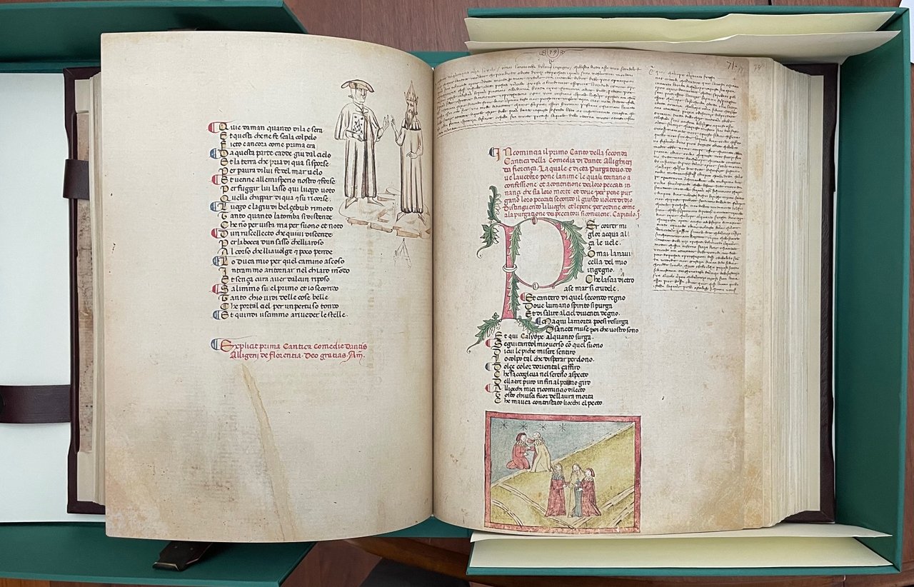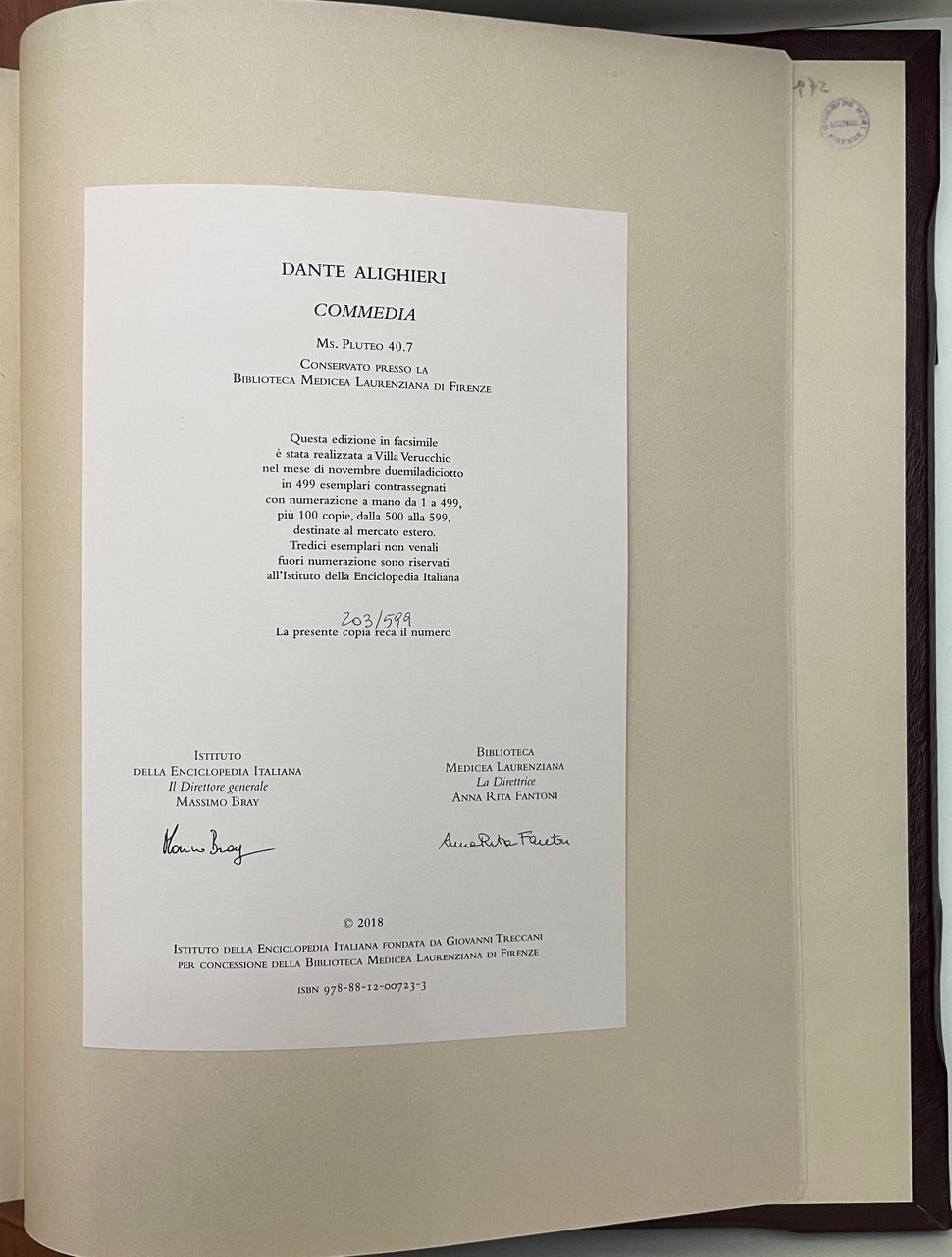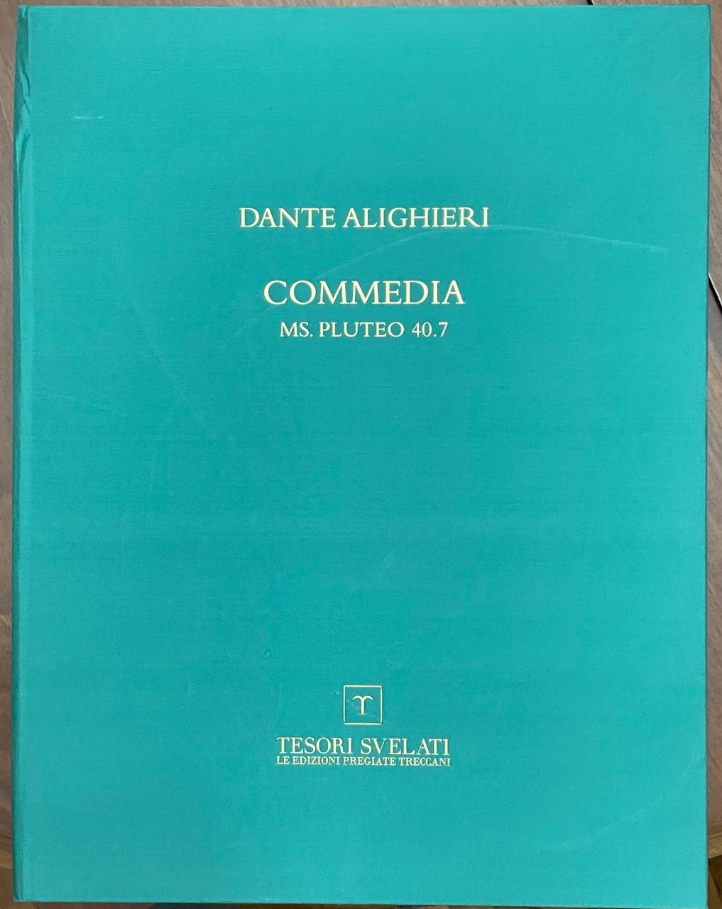 Commedia Ms. Pluteo 40.7 (Divine Comedy Ms. Pluteo 40.7). Biblioteca Medicea Laurenziana. Firenze. Istituto dell'Enciclopedia Italiana Treccani, Roma, 2018. Riproduzione in facsimile dell’opera di Dante Alighieri. Legatura in pelle. Formato 29x39 cm. Pagine 478. Commentario a cura di Sonia Chiodo, Teresa De Robertis, Gennaro Ferrante e Andrea Mazzucchi. Tiratura limitata a 599 copie numerate. Condizioni ottime.