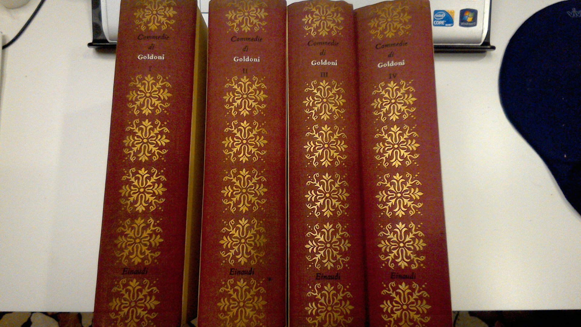 Raccolta di commedie di Carlo Goldoni. I quattro volumi contengono: L' uomo di mondo; La donna di garbo ; Il servitore di due padroni ; I due gemelli veneziani ; La vedova scaltra ; La putta onorata ; La famiglia dell'antiquario; Il teatro comico; Le femmine puntigliose; La bottega del caffè; Il bugiardo; La Pamela; La finta ammallata; I pettegolezzi delle donne; La locandiera; La cameriera brillante; Le massere; Il campiello; Gl'innamorati; I rusteghi; La casa nova; Le smanie per la villeggiatura; Sior Todero Brontolon; Le baruffe chiozzotte; Il ventaglio; Le bourru bienfaisant. In appendice del quarto volume; Belisario; Il gondoliere veneziano; Oronte re de' Sciti; Il mercato di malmantile.