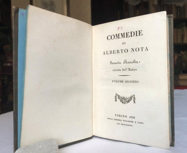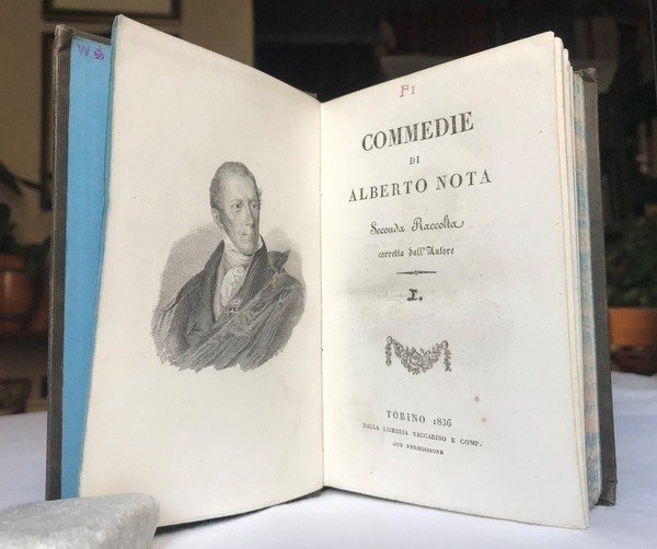 Due volumi in 8 piccolo (cm. 16 x 10), legati in tela editoriale, titoli al dorso ornato da decorazioni in oro, piatti in cornice impressa a secco, tagli marmorizzati, sguardie, antiporta con ritratto dell'autore al primo volume, frontespizi, dedicatoria a Re Carlo Alberto, di cui per lungo periodo fu bibliotecario, e prefazione dell'autore, XXI, 272, 288 pp., sommario ed annotazioni. Ogni commedia preceduta da un occhiello con l'indicazione della data, della compagnia e del teatro nel quale sia stata per la prima volta rappresentata, segue l'elenco dei personaggi. Forse le meno note fra le commedie dell'autore torinese sono contenute in questa raccolta: Petrarca e Laura, Lodovico Ariosto, Torquato Tasso, La Donna Irrequieta, Lo Sposo di Provincia, Il Prigioniero e l'Incognita. Bella edizione stampata a grandi magini su carta forte, gradevole la lettura. Di scarsa reperibilit.