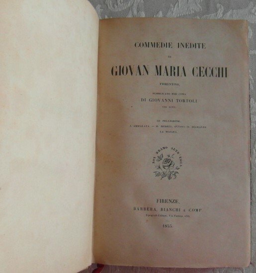 Barbera. 1855. In - 16 gr., mezza pergamena con angoli, fregi e titolo oro al dorso, pp. (4),XVI,453,(3). Vi sono contenute: "Le pellegrine. L'ammalata. Il medico, ovvero il diamante. La maiana". In buono stato