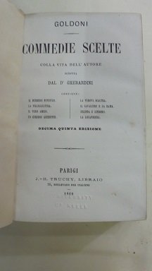 PARIGI, TRUCHY, 1869. In 16∞: pp. VIII + 672. Leg. in mz. pelle con angoli guasta al dorso. Timbro di estinto poss. Qualche fioritura. Contiene le seguenti commedie: Il Burbero Benefico. La Villeggiatura. Il Vero Amico. Un`Curioso Accidente. La Vedova Scaltra. Il Cavaliere e la Dama. Zelinda e Lindoro. La Locandiera.