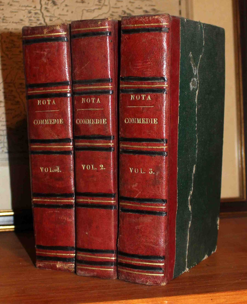 Tre volumi in 16°. Mezza pelle rossa dell'epoca con titoli e filetti oro sui dorsi. Copia in buono stato. Vol. I:Le risoluzioni in amore. Il benefattore e l'orfana. Il filosofo celibe. La vedova in solitudine. L'ammalato per immaginazione. Il nuovo ricco. Alessina, ossia costanza Rara. Volume II: Il progettista. I primi passi al mal costume. La duchessa della Vallière. L'ospite francese. Il bibliomane. La donna ambiziosa. L'atrabiliare. Vol. III: La pace domestica. La lusinghiera. I litiganti. I dilettanti comici. Amor timido. La fiera. L'oppressore e l'oppresso. La novella sposa.
