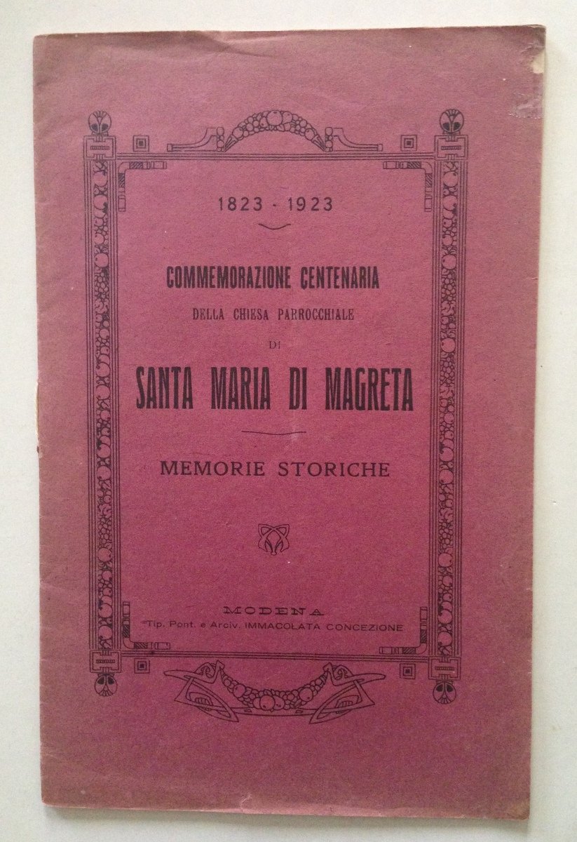 D. A. Rabetti, Commemorazione centenaria della Chiesa Parrocchiale di Santa Maria di Magreta Memorie storiche Tip. Pont. e Arciv. Immacolata Concezione, Modena 1923, cm 21.5x13.5, pp. 17, ill. in b/n f.t, brossura ed. Condizioni di conservazione. Esemplare in buono stato con tracce d'uso e del tempo e con qualche brunitura; brossura editoriale con qualche abrasione, qualche pieghetta ai margini e agli angoli; interni buoni e saldi. MOD.01OP00022 MT