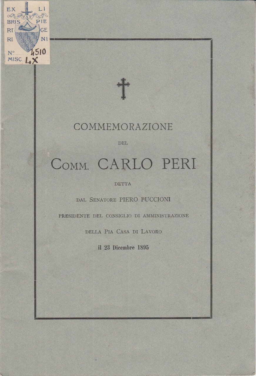 Commemorazione Del Comm. Carlo Peri Detta Dal Senatore Piero Puccioni Presidente Del Consiglio Di Amministrazione Della Pia Casa Di Lavoro Il 23 Dicembre 1895