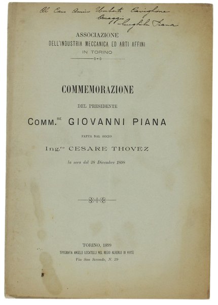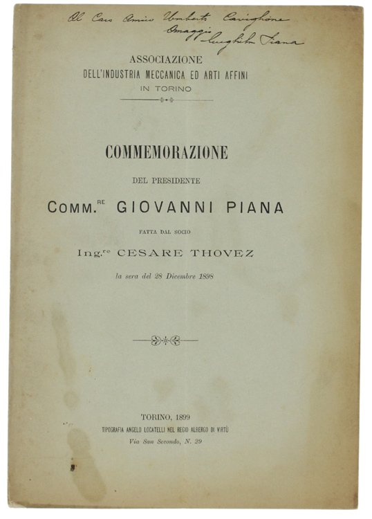 (Codice LO/7322) In 8° 8 pp. Brossura editoriale, ottimo stato, con dedica in copertina. Allegato estratto di verbale del consiglio comunale di Torino, 21 dicembre 1898: commemorazione di Giovanni Piana. ~~~ SPEDIZIONE IN ITALIA SEMPRE TRACCIATA
