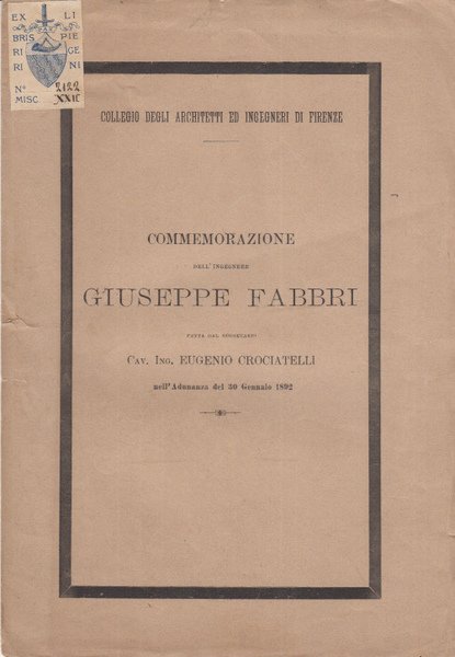 In-8 (Cm 24,5 x 17,2), pp. 4 pagine non numerate. Ex libris Pieri Gerini. Brunitura diffusa, piccolo strappetto al margine interno. Ordinari segni del tempo. BUONO - Giuseppe Fabbri nacque a Villamagna vicino Firenze il 10 Agosto 1825, studio' presso i PAdri Scolopi. Fu per anni aiuto dell'Ing. Gaetano Coli e successivamente fu ingegnere degli stabilimenti del Bigallo e dell'Ospedale degli'Innocenti. Estratto dagli Atti del Collegio degli Architetti ed Ingegneri di Firenze.