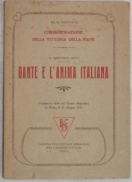 In 16. Dim. 18x13 cm. Pp. 62. Raccolta di due discorsi detti nel Teatro Argentina il 23 Giugno 1921. Il primo è la commemorazione dell'Onorevole Luigi Rava sulla vittoria del Piave. Il secondo dell'onorevole Innocenzo Cappa, un discorso su Dante. Senza data ma degli anni '20. Brossura editoriale in ottime condizioni generali con lievi usure ai margini e dorso. Legatura in ottime condizioni. All'interno le pagine si presentano in ottime condizioni con rare fioriture. Lievi gore d'umidità alla prima pagina di sguardia. Colelctio of two speeches told in the Argentina Theatre the 23 of June 1921. The first one is the commemoration by Luigi Rava of the victory on the Piave. The second one was told by Innocenzo Cappa, and it is a speech about Dante. Not dated but of 1920's. Editorial cover in very good general conditions slightly worn in the edges and spine. Binding in very good conditions. Inside pages are in very good conditions with occasional foxings. Slight humidity stains in the first endpaper.