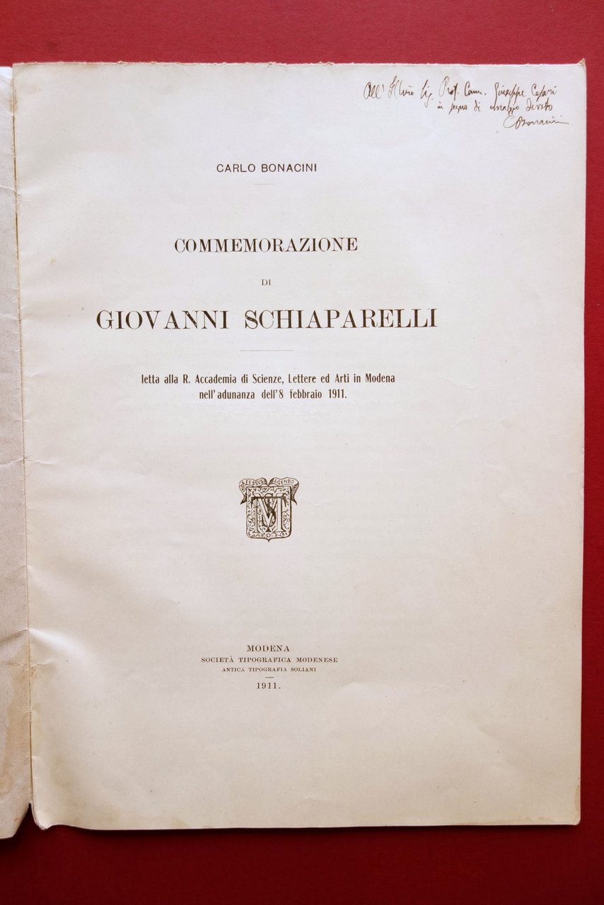 Carlo Bonacini, Commemorazione di Giovanni Schiaparelli letta alla R. Accademia di Scienze, Lettere ed Arti in Modena nell'adunanza dell'8 febbraio 1911 Soc. Tip. Modenese - Antica Tip. Soliani, Modena 1911; cm 31,5x23; pp. 18; brossura ed. Frontespizio con dedica autografa dell'autore. Condizioni di conservazione Esemplare in buone condizioni con tracce d'uso, minima traccia di piega longitudinale, angolo inf. sinistro con ammaccaura e minima pieghetta; angolo inf. destro della brossura ant. con una lieve marginale ombra di gora che non interessa le pagine. Interni buoni. Dedica autografa dell'autore al frontespizio. SC03.D16269 N BIS