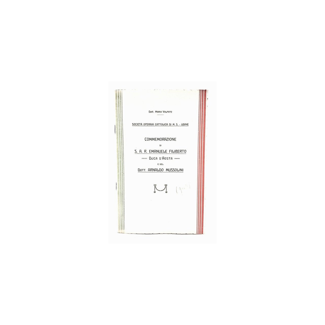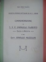 PRIMA ED UNICA EDIZIONE, opuscolo curato dalla società cattolica di mutuo soccorso di Udine Riproduzione del testo pronunciato da Mario Volpato in occasione della commemorazione della scomparsa di Emanuele Filiberto e di Arnaldo Mussolini. In brossura. Pp. 20. Ottime condizioni.