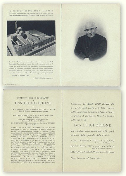 Commemorazione Don Luigi Orione nel trigesimo della morte. Università Cattolica Milano 14 Aprile 1940. Invito.