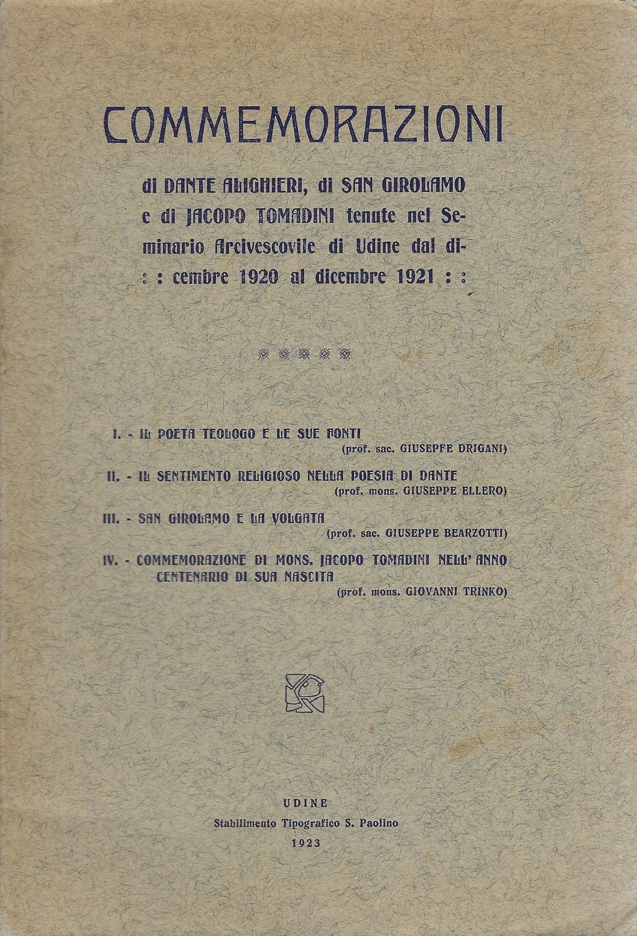 Commemorazioni di Dante Alighieri, di San Girolamo e di Jacopo Tomadini tenute nel Seminario Arcivescovile di Udine dal dicembre 1920 al dicembre 1921