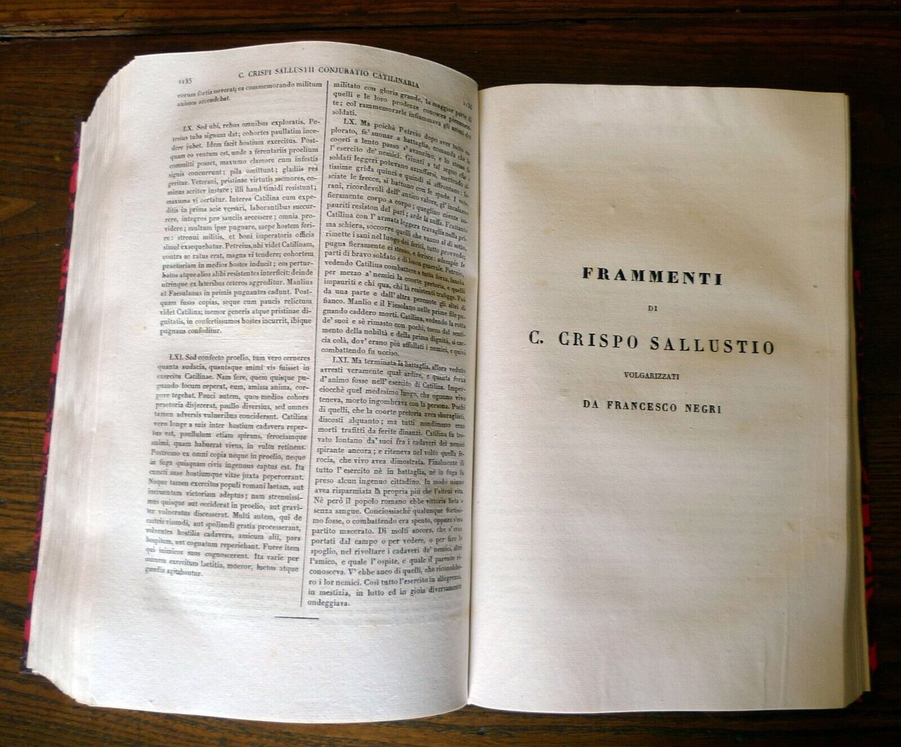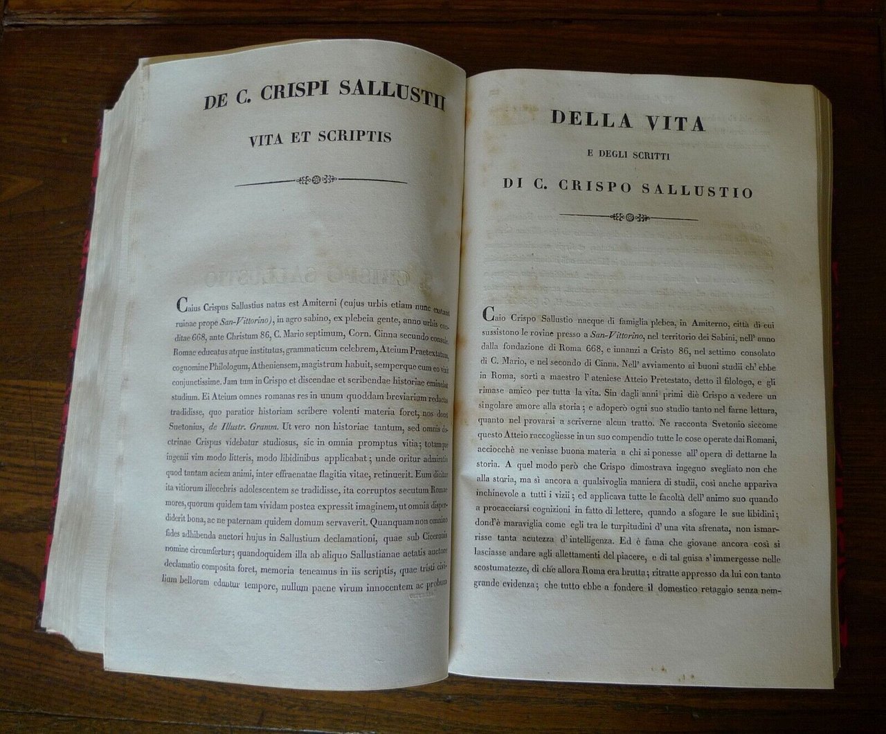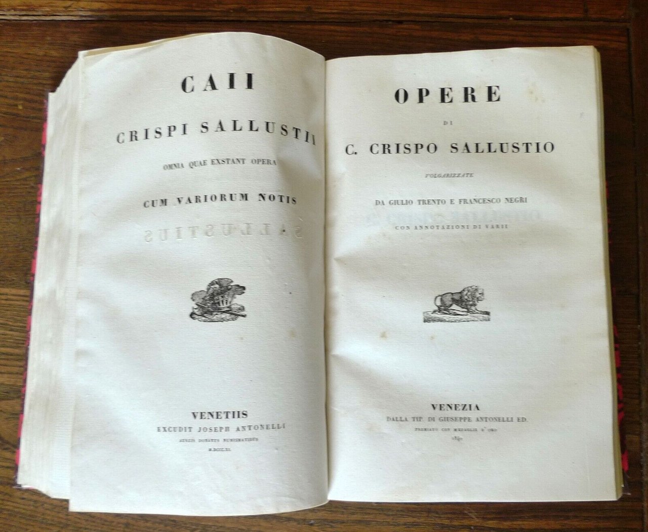 - CAII CRISPI SALLUSTII OMNIA QUAE EXSTANT OPERACUM VARIORUM NOTIS.OPERE DI C. CRISPO SALLUSTIOVOLGARIZZATE DA GIULIO TRENTO E FRANCESCO NEGRI.Venetiis, excudit Joseph Antonelli,Venezia dalla Tip. di Giuseppe Antonelli Ed., 1840